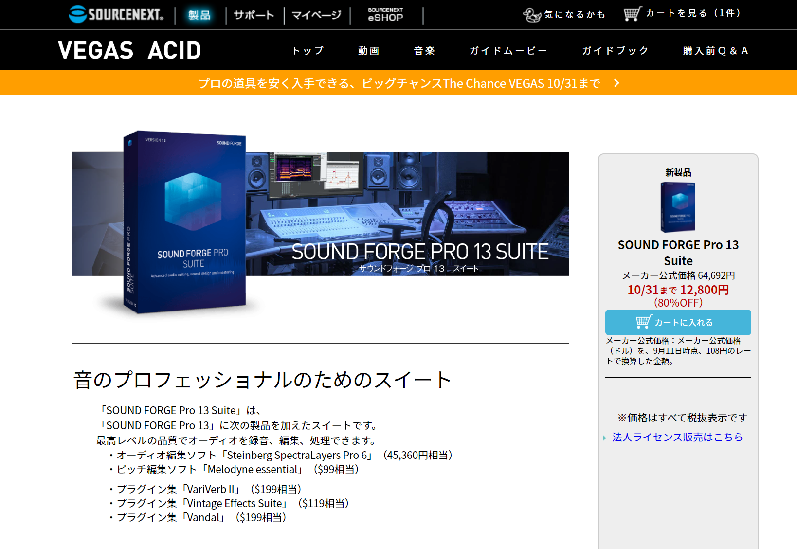 ソースネクストサイトからSound Forge Pro 13 Suiteに収録される形で販売中。現在80%オフの12,800円