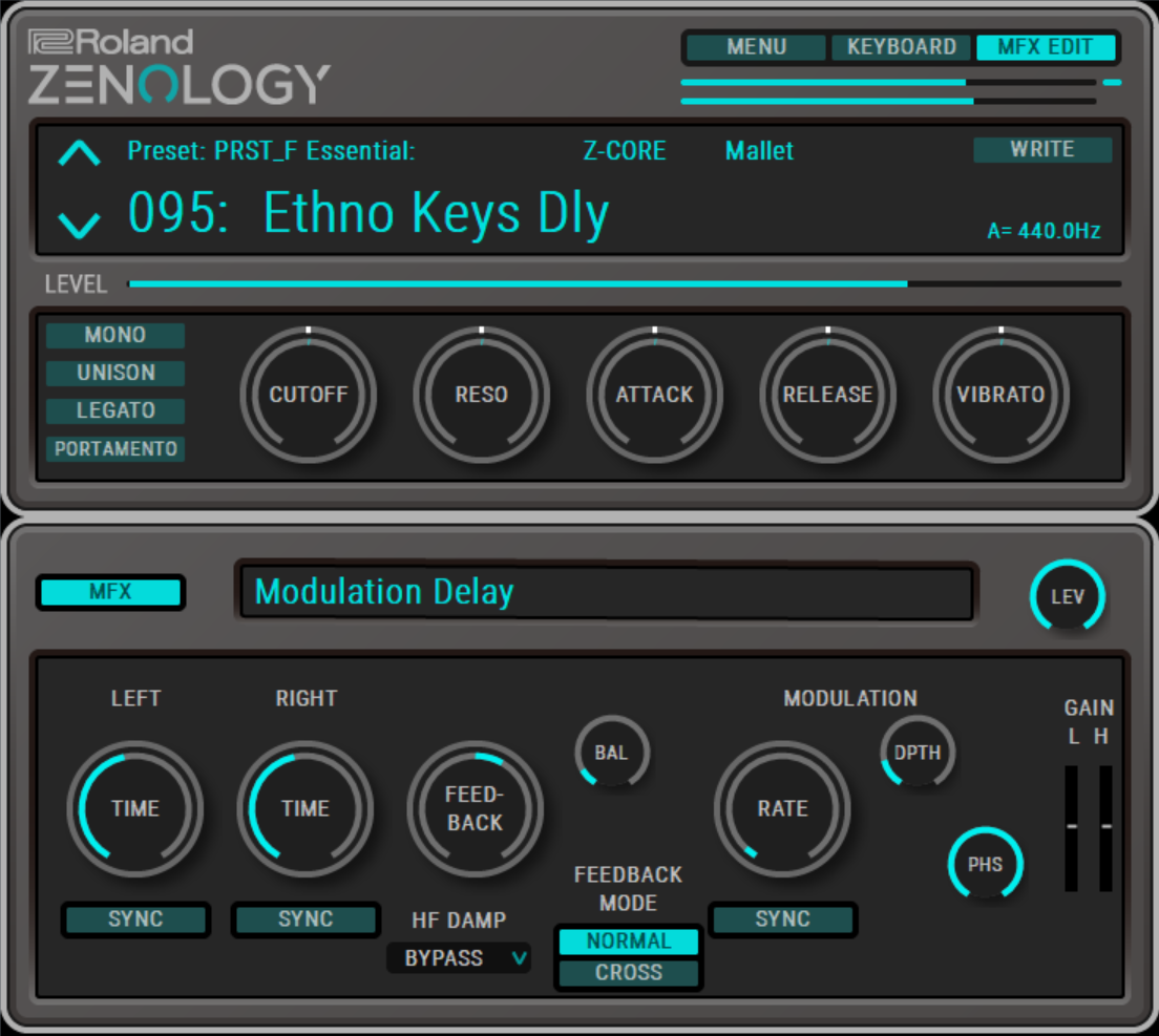 実際、ZENOLOGYを立ち上げてみると、シンプルなUIながら、非常に使いやすい印象です。メインの画面では音色番号を選び、LEVELとCUTOFF、RESO、ATTACK、RELEASE、VIBRATOという5つのパラメータがありユーザーが必要の応じて調整可能です。またMONO、UNISON、LEGATO、PORTAMENTOのスイッチも用意されており、これらは音色によってオン/オフされますが、これらもユーザーが設定できます。