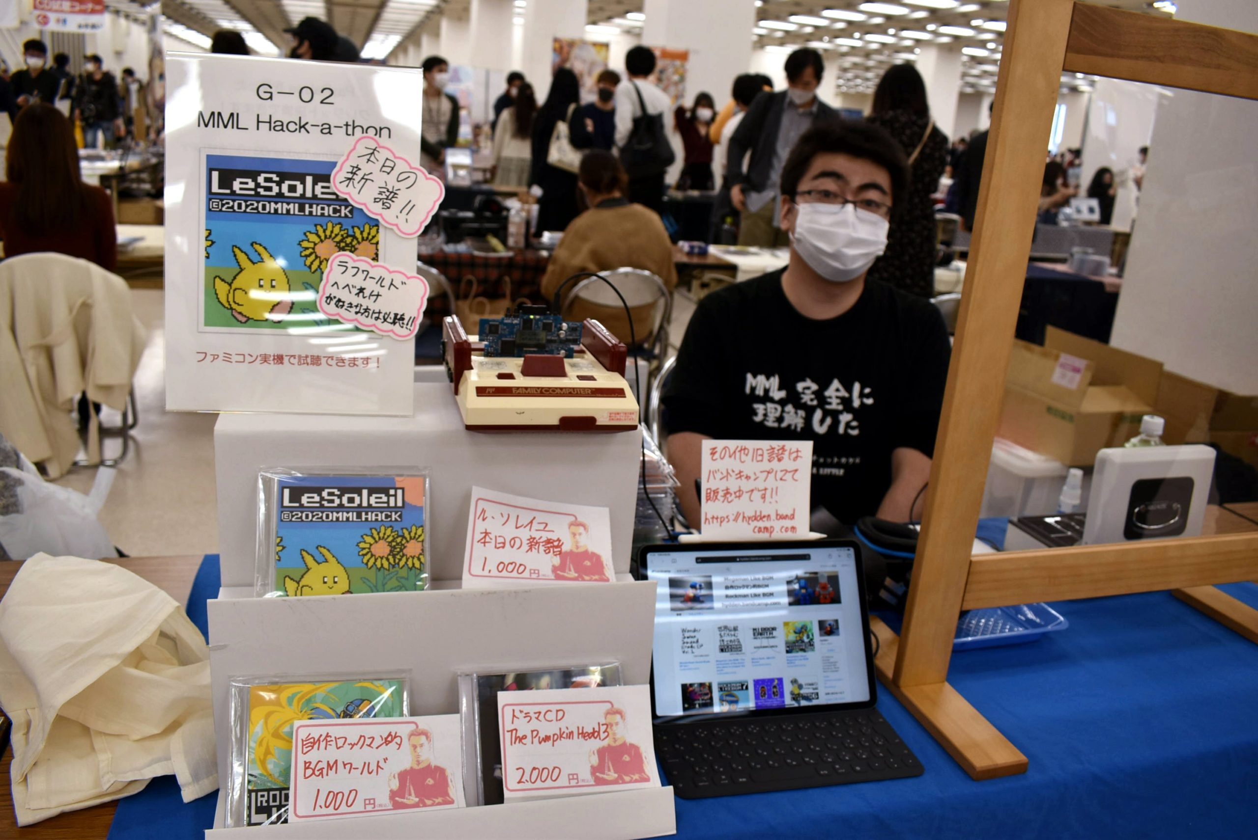 M3会場を歩いていて、ふと目にとまったのが、ファミコンに基板が刺さった不思議なものを展示していたハイデンさんのブース。「MML完全に理解した」とか妙なことが書いたTシャツを着ているのでますます気になります。