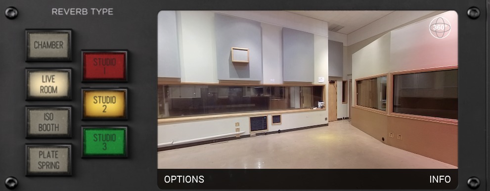 ちなみにT-RackS SUNSET SOUND STUDIO REVERBの中央にある画面は、360度の画像となっているため、動かすことができ、どんな場所の残響音なのか確認できます。画像を見ると、なんとなくイメージできるのは、いいですよね。