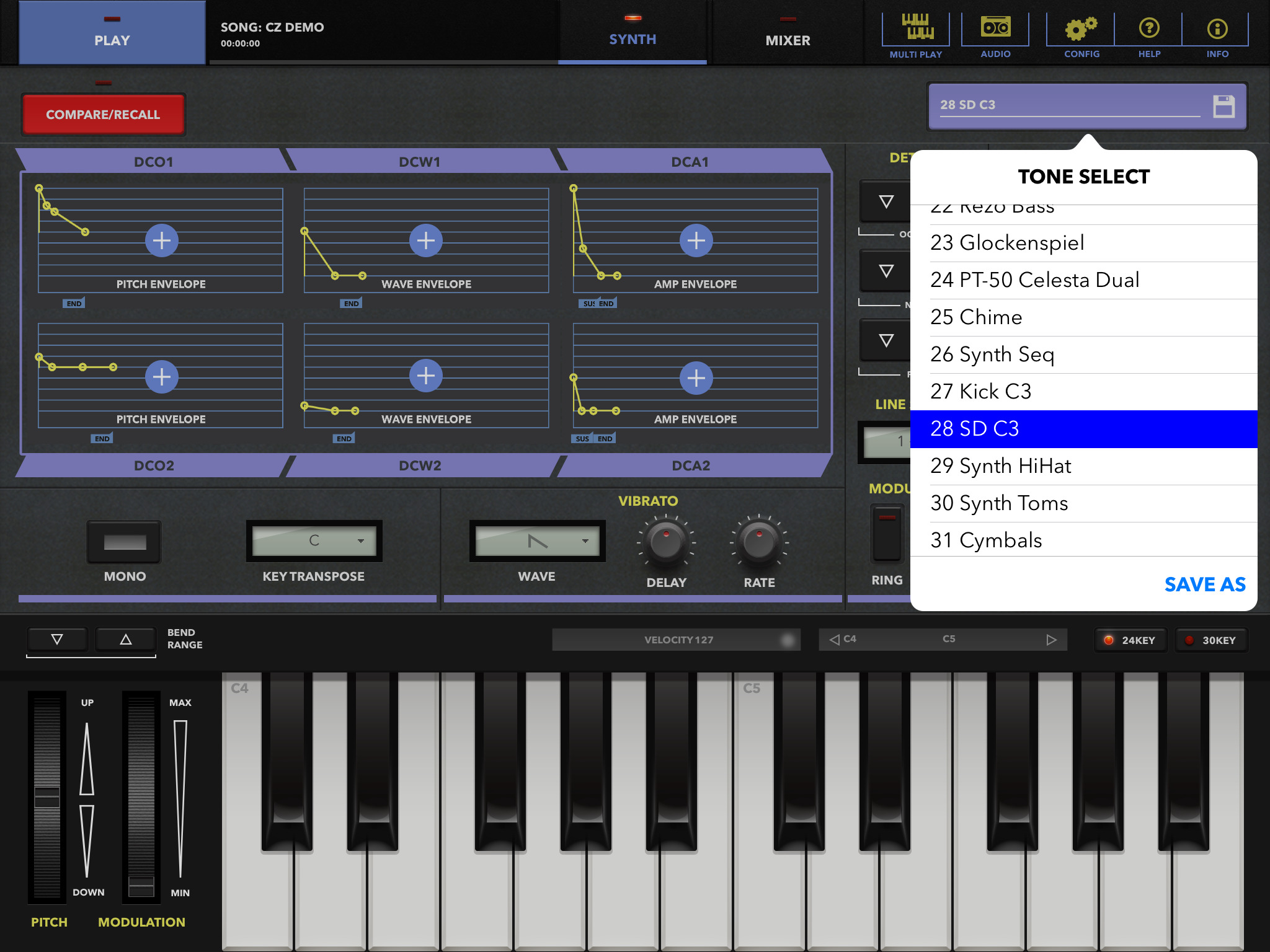 その記事にもあった通り、PD音源のオシレーター部分=DCO(Digital Controlled Oscillator)は、ノコギリ波や矩形波、パルス波など8種類の基本波形を持ち、これらのうち2つ組み合わせることで作られる33種類の基本波形が生成されます。DCO1、DCO2と2つのDCOがあるほか、フィルタのように音色づくりをするDCW(Digital Controlled Wave)、アナログシンセのVCAに相当するDCA(Digital Controlled Amplifier)も2つずつある、パワフルなシンセサイザになっています。