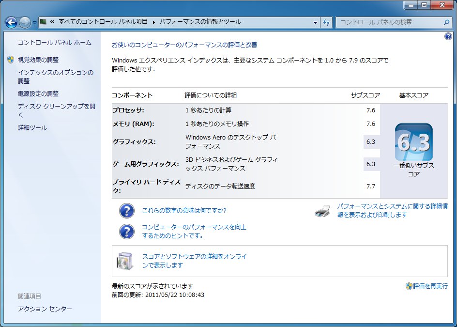 64bit版と32bit版のOSそれぞれを使えるようにしましたが(バックアップソフトのTrueImageで3分程度で書き戻して使う)、ここでは64bit版について見てみましょう。まず試してみたのがWindows標準のベンチマークであるパフォーマンス評価。1.0~7.9のスコアをつけるものですが、プロセッサは7.6とほぼ最高値。一番低いグラフィックスでさえ6.3とすごい数字が出ています。右に表示される数字、前のマシンでは4.6でしたからすごい向上ですね。