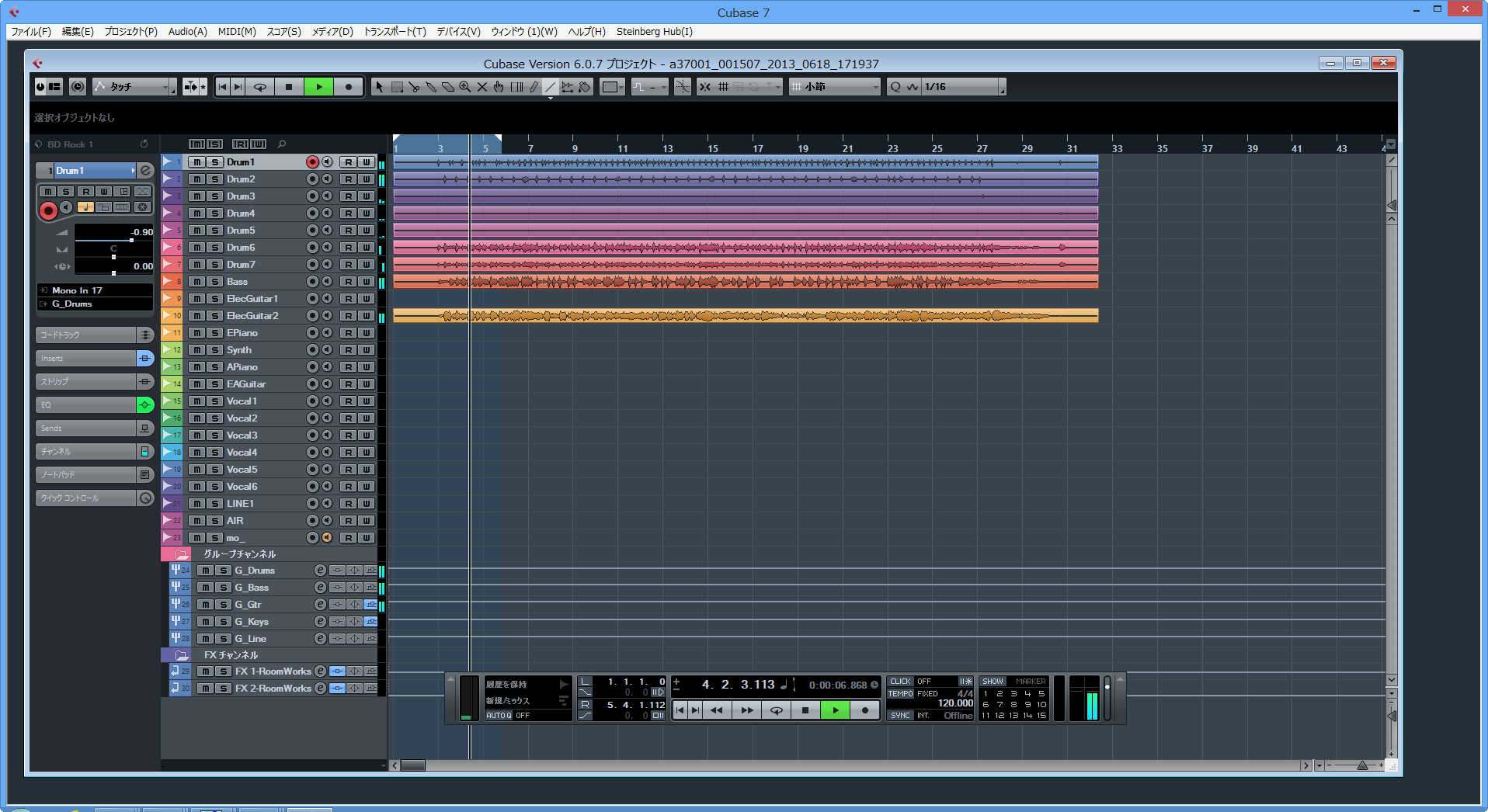 が、ここではCubase7でcprファイルを開いてみました。その結果が、この画面です。「入力デバイスにMR816csxがない」といったメッセージが表示されますが、その辺は無視。自分のオーディオインターフェイスを設定しておくと、スタジオで録ったものが完全な形で手元で再現することができました。