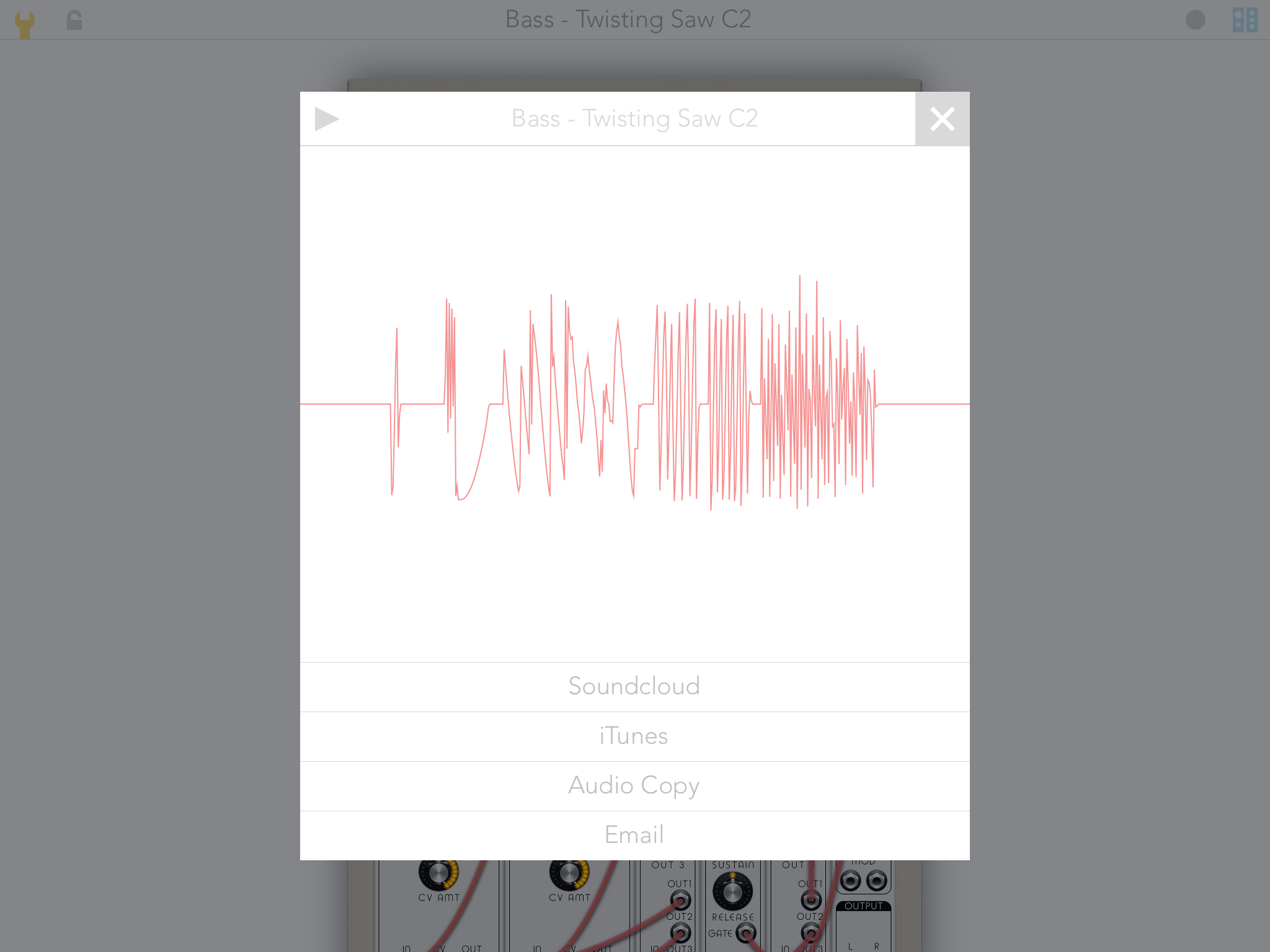 また、前述のとおり、プリセット音色には有料のモジュールが使われているわけですが、これら有料モジュールそのものは、いじれなくてもその接続先を切り替えることは可能なので、ミキサーやスプリッターなどを噛ませていくことで、お金を払わなくても結構遊ぶことができそうですよ。また、演奏した結果をオーディオとしてレコーディングすることも可能で、それをAudio Copyでほかのアプリに受け渡したり、メールで送ったり、Sound CloudにUPする機能なども搭載しているようです。
