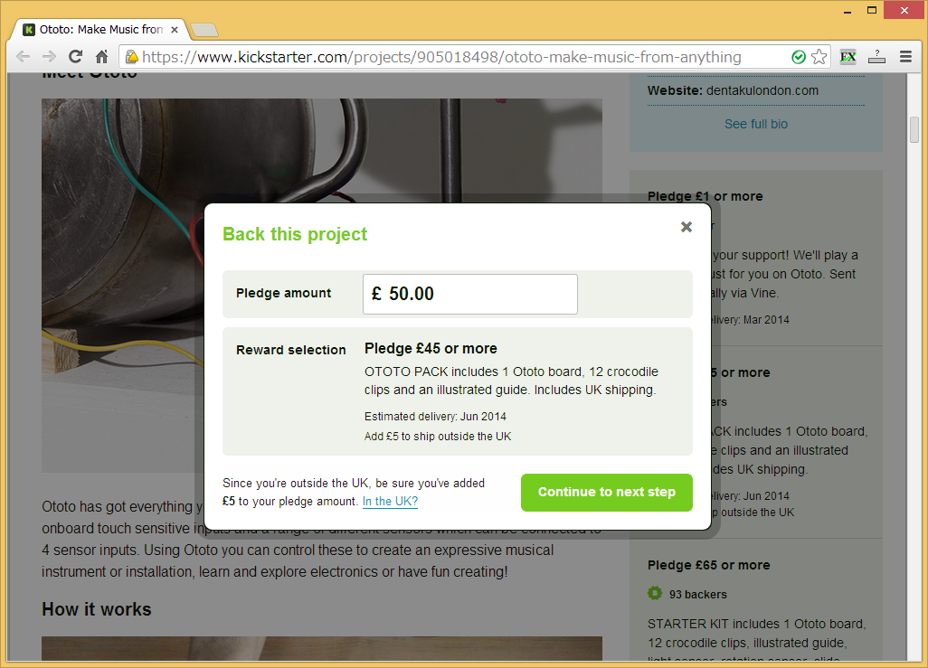 2月11日現在、賛同者=backersの数は247人で、投じられた金額は19,457ポンドと到達率約40%。backersの一覧を見ることができるので、チェックしてみたところ、日本人も何人かおり、しかも先日の記事「Web Music時代到来!楽器、ツールは自分で作ろう!?」で紹介した「Web Musicハッカソン」にも参加していた知人が複数いたところは、「なるほど」と思ったところでした。
