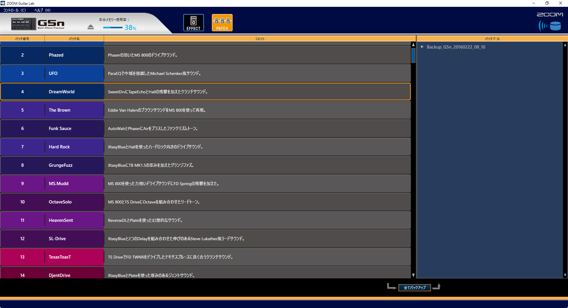 この際、G5nの中にあるパッチすべてがPCに吸い上げられ、PC上でパッチおよびエフェクトを一覧することができます。
