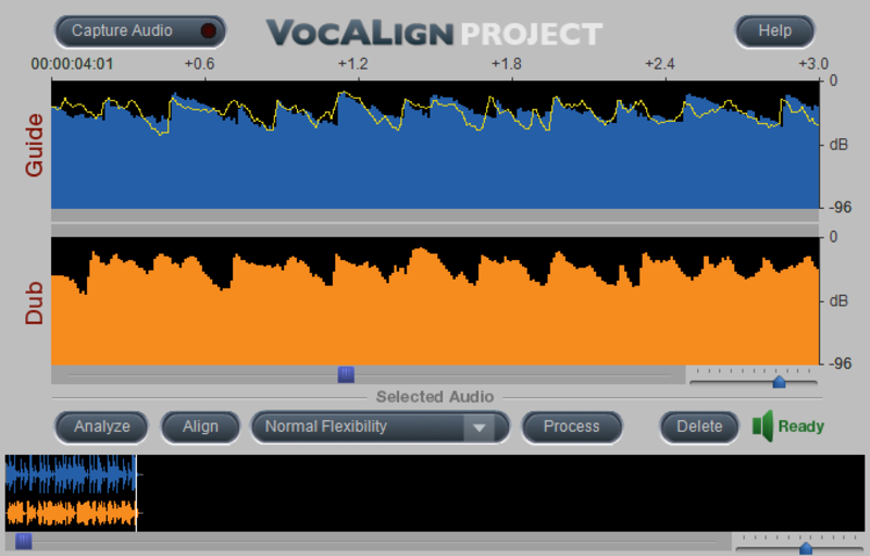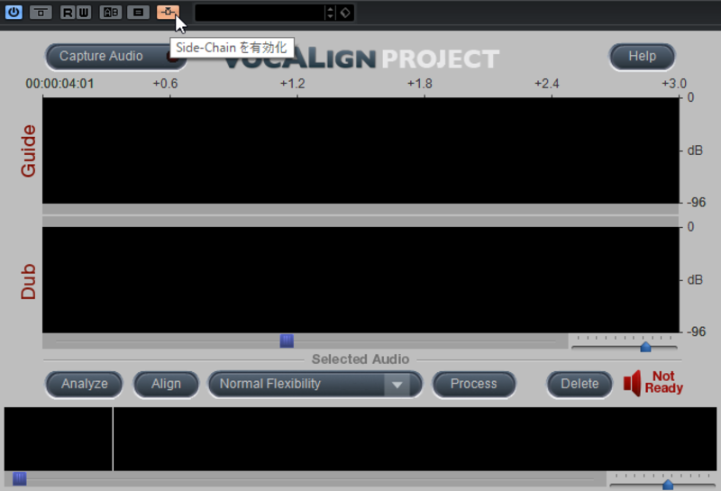 これでガイドとなるドラムトラックが、VocAlignの上のGuideのところへ、タイミングを合わせるべきラップのボーカルトラックが下のDubのところへと取り込まれたので、準備完了。あとはProcessボタンを押すと、ガイドのタイミングに合わせてボーカルをタイムストレッチして合わせ込んでくれるのです。
