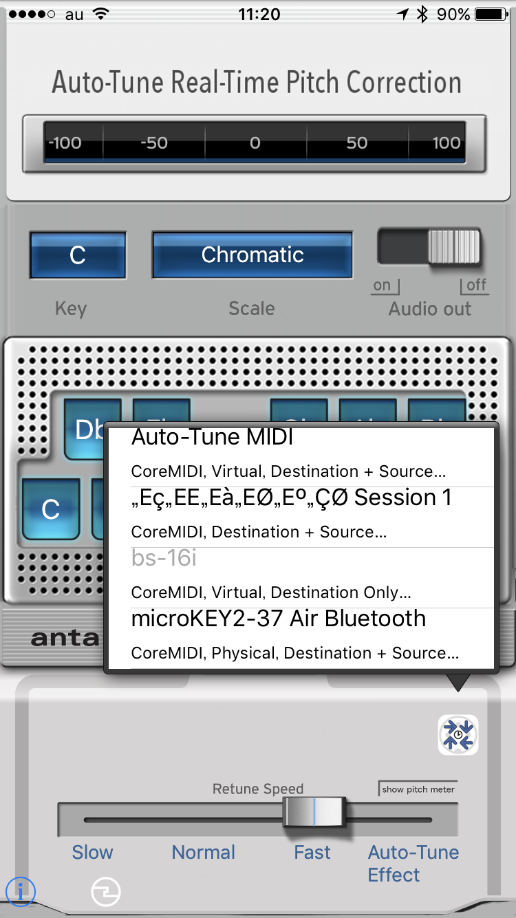 Auto-Tune Mobileの画面右下の4つの矢印のボタンをタップすると入力するMIDIインターフェイスを指定することができるので、接続したキーボードをオンにしてください。この状態でMIDIキーボードを弾くと……。そう、これで使う音程を指定することができるんです。つまりキーボードでコードを抑えながら歌っていけば、特定の音程に固定されるのではなく、曲の進行に合わせて変えていくことが可能になるわけです。ちょっとボコーダー的に使い方ですよね。
