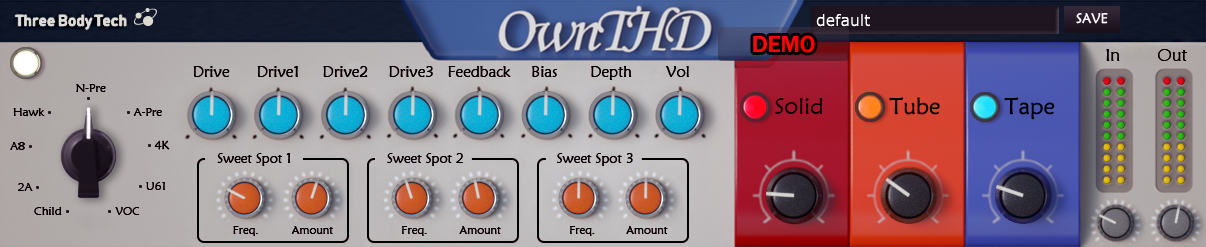 そのThree-Body Technologyが先日、第2弾製品、OwnTHDをリリースしました。今度はソフトウェア音源ではなく、エフェクト。それもサチュレーションにターゲットを絞ったものであり、ギター用にはもちろんのこと、ドラム、ベース、キーボード、ボーカルなど、さまざまな音源を簡単に気持ちいいサウンドに仕上げてくれるというもの。現在において、サチュレーションエフェクトというのは、そう珍しいものではないのですが、このOwnTHDは手軽に自分だけのオリジナル・サチュレーションサウンドを作り出せる、という点を前面に出したユニークなプラグインです。価格はアメリカドルで$129ですから日本円で計算すると税抜きで14,000円ちょっとです。実際どんなものな試してみたので紹介してみましょう。