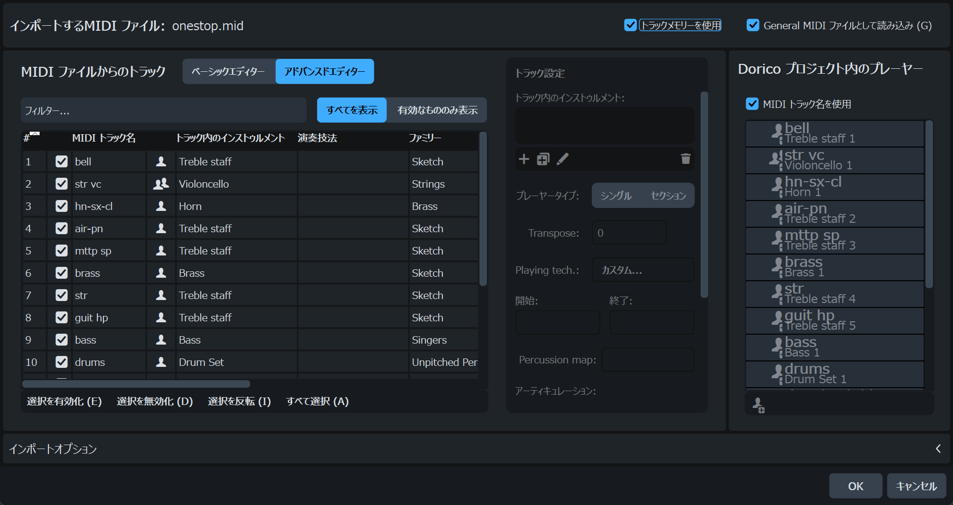 スマートなMIDIデータインポートの画面。MIDIデータを読み込むと自動的に割り振られていく