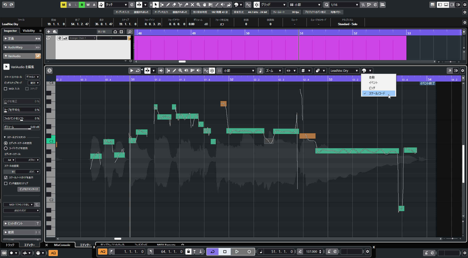そして、Cubase 9から搭載され始めたスケールアシスタント機能がVariAudioの編集でも適応できるようになりました。キーエディターに搭載されている機能と同じく、エディター全体で単一のスケールを選択したり、コードトラックに沿ったスケールノートガイドの表示、指定したスケールに沿ったピッチ編集のスナップが可能。左ゾーンにスケールアシスタントの項目が追加され、スケールにスナップした編集ができるようになりました。
