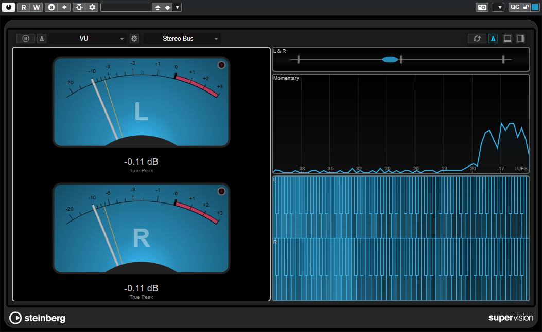 そして最後にSuperVisionにVUメーター、LRバランス、レベル・ラウドネスのヒストグラム表示、キーボードタイプのスペクトム表示が追加。これでかなりの種類のメーターが搭載されていることになるので、サードパーティー製のプラグインを使わなくても、十分にモニターすることができますね。