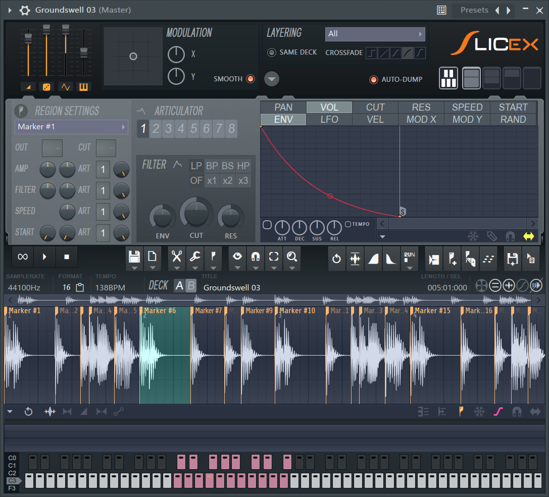 では、ReCycle!のようなスライスインストゥルメントであるSlicexを選んでみましょう。すると、スライスされた数だけパッドが点灯し、それぞれを押すと、スライスされた音がトリガーされるのです。これはFruity Slicerでも同様ですね。