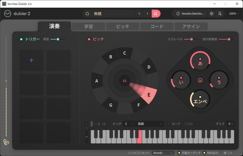 まず「演奏」は、声でMIDI入力するときに選ぶ画面です。最初にこの画面が表示されたときに声を出してみると、デフォルトの設定で、シンセを鳴らすことができるようになっています。この際、マイクを接続したオーディオインターフェイスの出力からシンセ音がなる形です。そう、Dubler 2自体も音源を持っているので、適当に声を入れてみるだけで、その声のピッチで音源の音を鳴らすことができるのです。この際、ほぼリアルタイムにシンセサウンドに変換できるのにはちょっと驚きます。どこまでリアルタイムであるかは、先ほどのキャリブレーション時に設定するバッファサイズ次第ではあるのですが、違和感はまったくなく使うことができました。