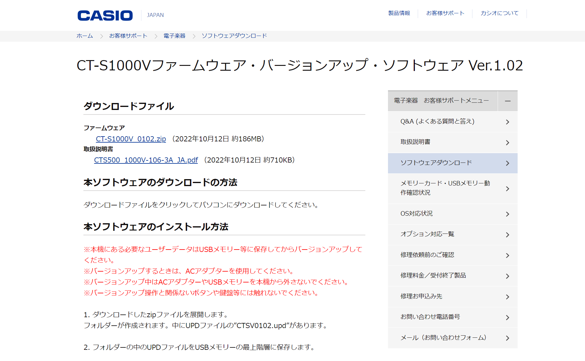 CT-S1000Vのファームウェア、Ver.1.02はCASIOサイトからダウンロードできる