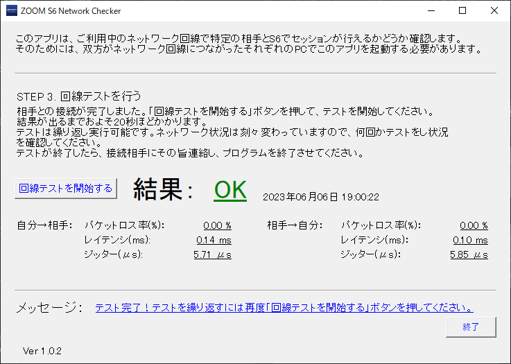 川村:条件下でテストを実施しました。我々で実験をしていていい結果が出ていた環境がNUROです。集合住宅の場合、最後のメタル配線部分までいくと制限が出てくることはあるようですが、最近は集合住宅でも、宅内まで光を通す回線工事をしているようなのでその辺もカバーできているようです。メタル回線になると全然ダメかというと、そうでもなく、徐々に重しが乗ってくる感じでしょうか。戸建ての光回線であれば高い確率でセッションが可能であるという実験結果が得られています。ケーブルテレビ系は総じて厳しい感じで、応答性の面でネックとなっています。それが結果としてレイテンシーにつながります。どうしてもネットワークでのジッターが発生すると、その待ち合わせが発生するので、バッファを大きくとることになりますが、それでも音が途切れてしまったり…。基本的に光回線での使用を推奨します。また、購入前に回線速度を評価できるよう「ZOOM S6 Network Checker」というWin/Mac用のアプリを作成しました。このアプリはS6の通信をエミュレートして動作します。セッション予定の二拠点を結んで「ZOOM S6 Network Checker」を使用して頂く事でレイテンシー、ジッター、パケット損失を事前に評価することができます。