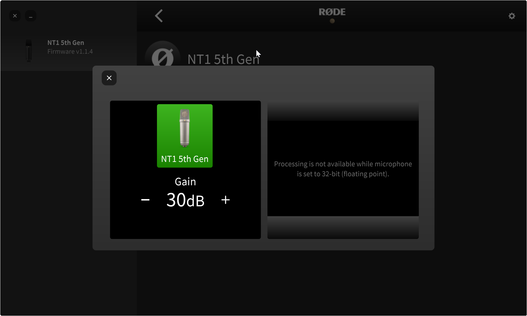 さて、これでNT1(第5世代)を32bit floatで使うことができるわけですが、このNT1にはもう一つ優れた機能が装備されています。それは内部にDSPを持っていて、レコーディングの音を調整できるという点。このオーディオプロセッシングは「24bit/48kHzのデジタル出力時のみ有効」ということなので32bit floatでは利用できないようです。この機能は先ほどファームウェアアップデートで使うということ取り上げたRØDE Centralというソフトを使って設定していきます。