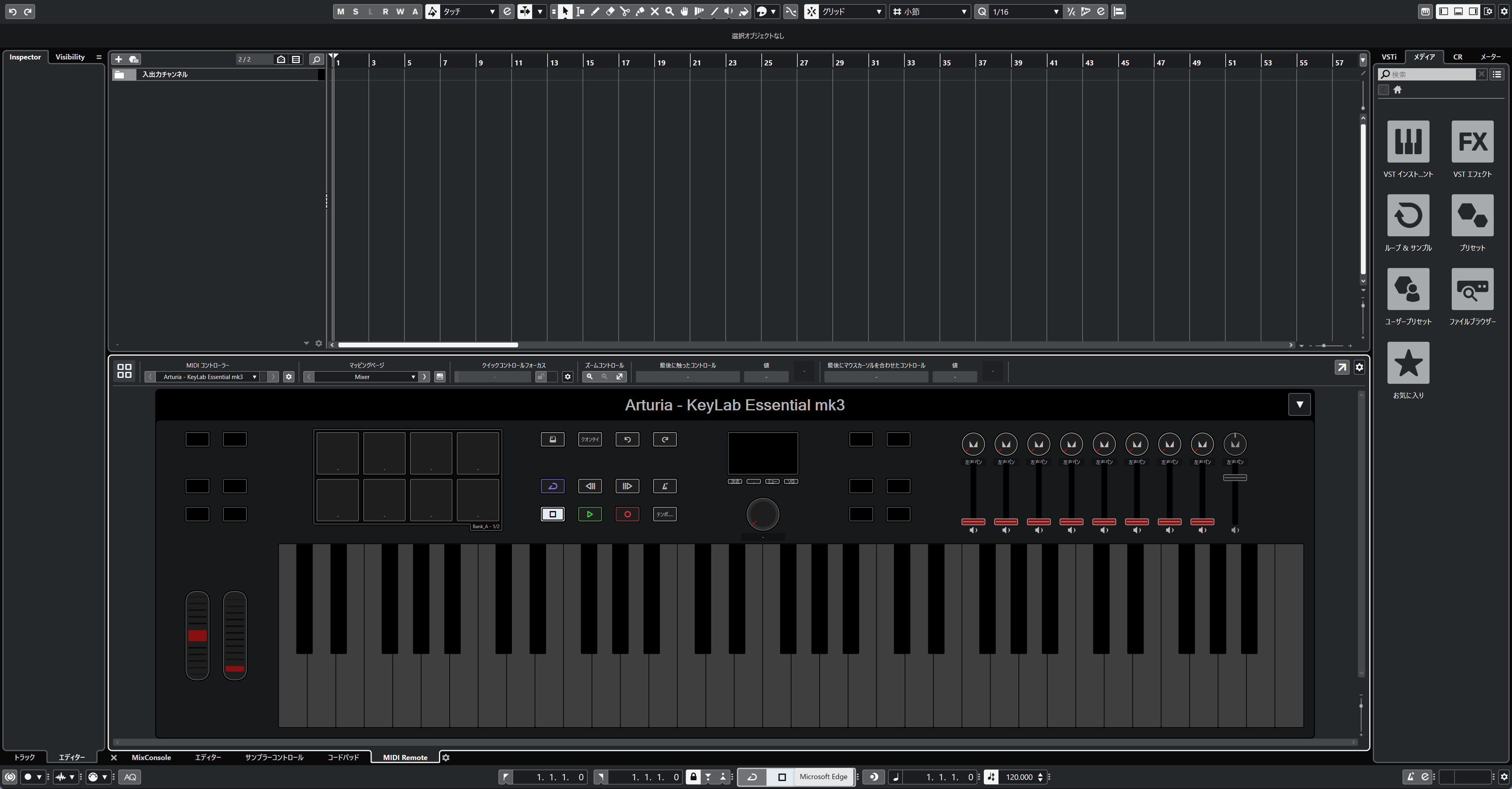Cubaseを起動して、新規プロジェクトを作成すると、下ゾーンにKeyLab Essential mk3の画面が表示されている