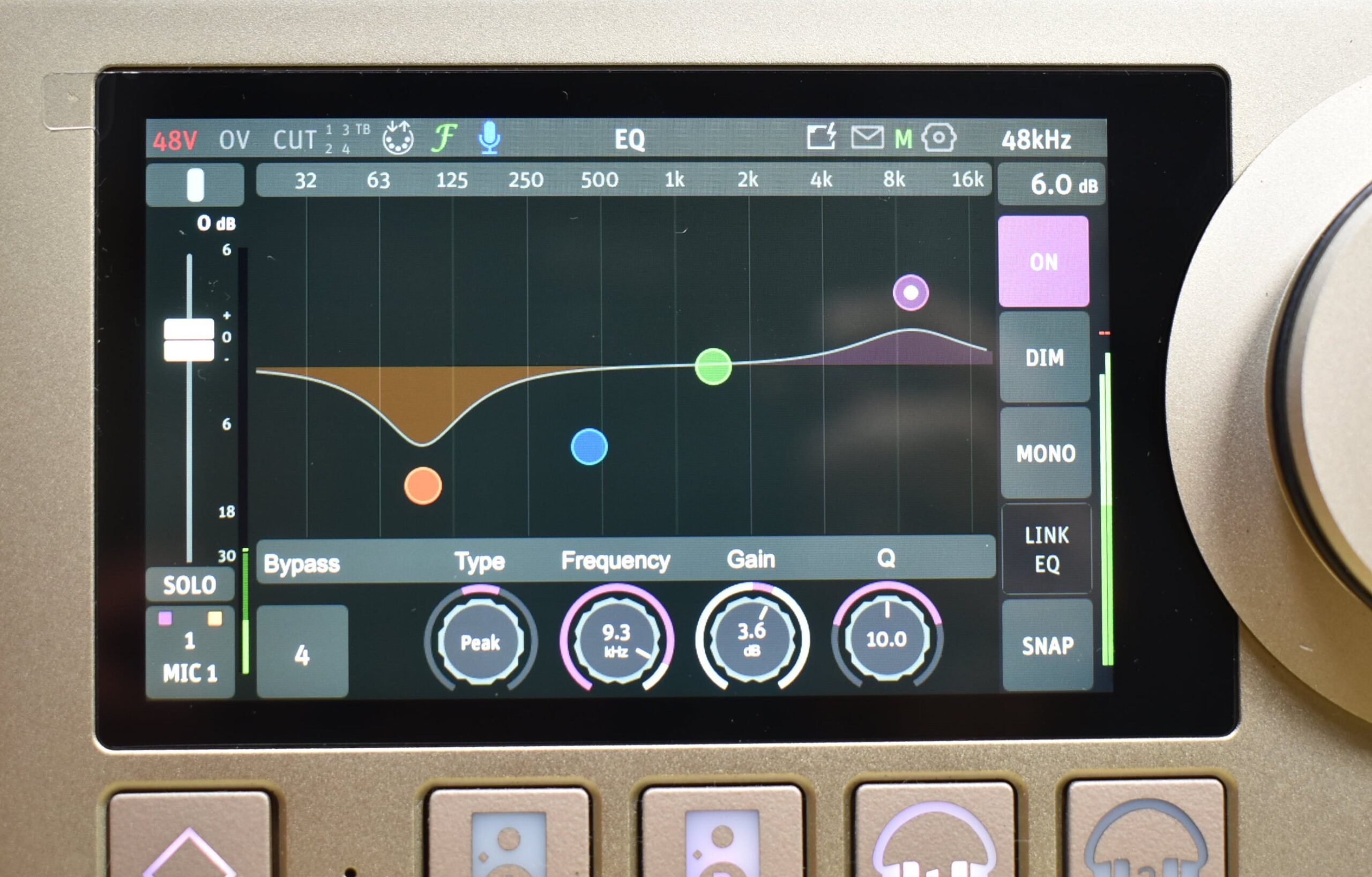 ここには実測で10cmx6cmという、ちょうどスマホを横にしたようなタッチスクリーンディスプレイを搭載されており、ここでさまざまな操作ができるとともに、大きなノブを使って繊細なコントロールができるようになっているのも特徴。