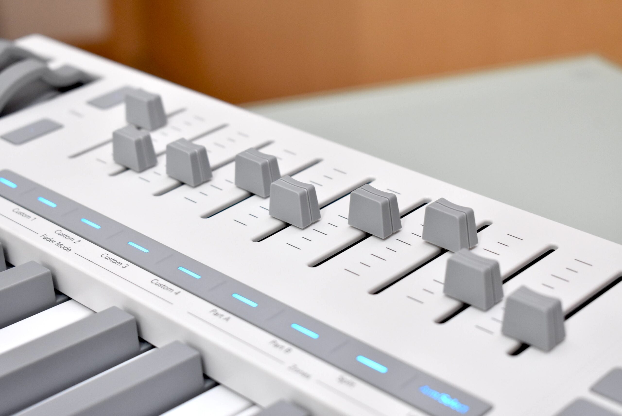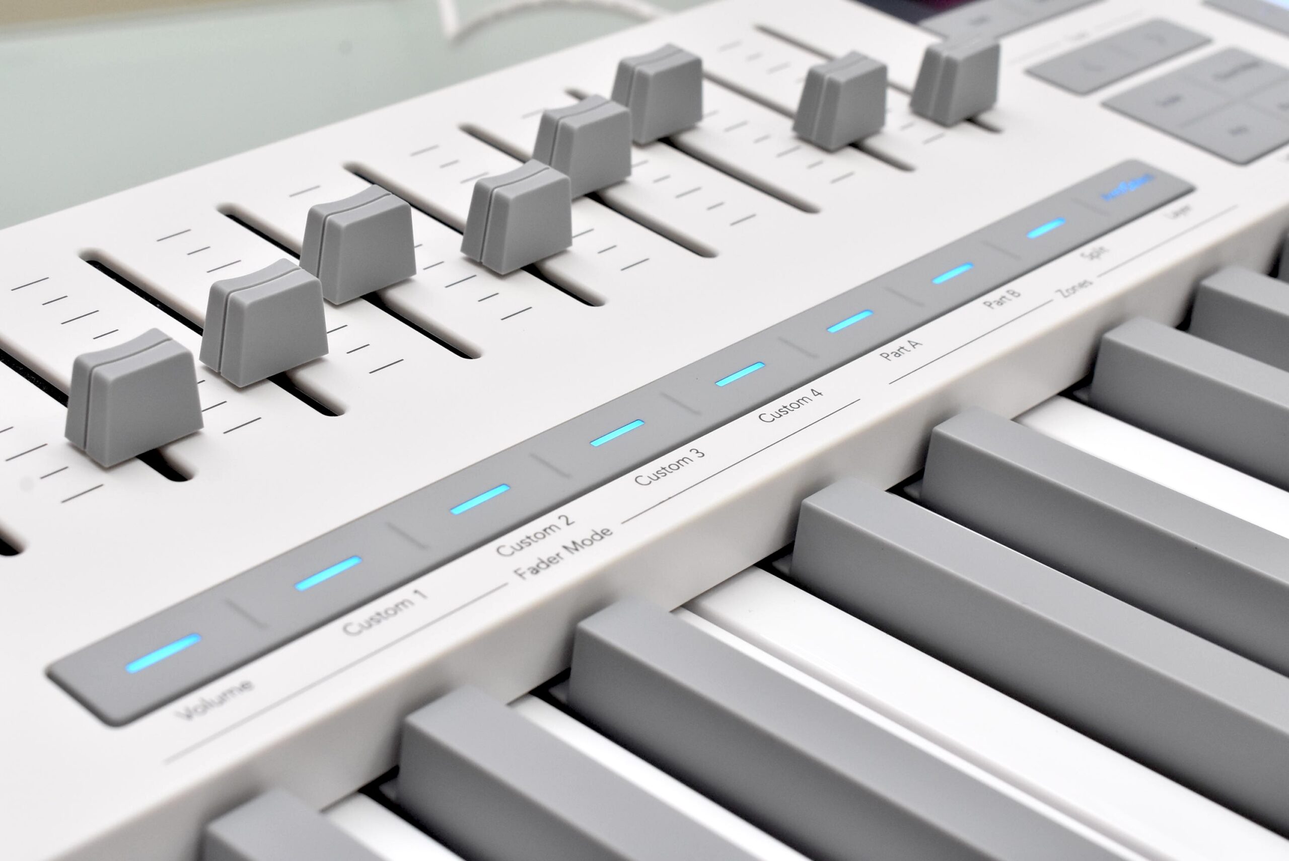 49鍵と61鍵モデルにはフェーダーが搭載されており、ミキシング作業において大きな効果を発揮します。61鍵モデルは9本、49鍵モデルは8本のフェーダーを備えており、DAWのミキサーと連動させることで、各トラックのボリュームを直感的に操作できます。また、シンセサイザのエンベロープパラメータ、いわゆるADSRのコントロールや、ドローバーオルガン音源の操作など、多彩な用途に活用できるのも大きなポイントです。