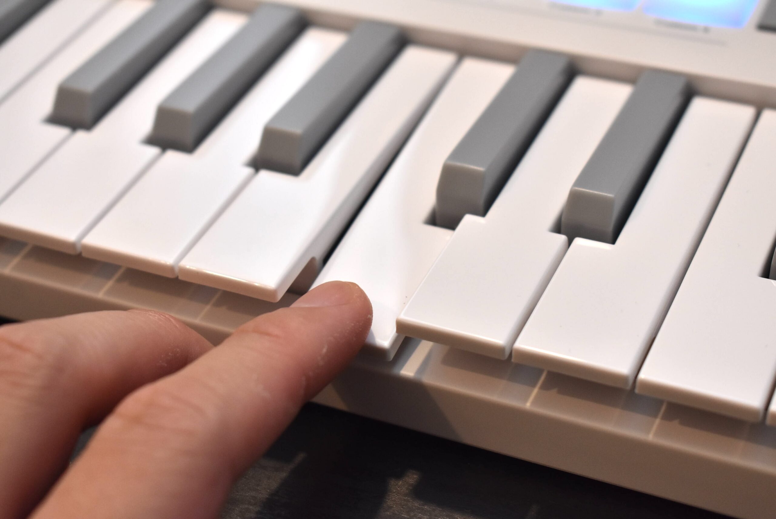 さて、まずはハードウェア部分から見ていきましょう。Miniシリーズのミニ鍵盤ですが、これは前モデルと比較して格段にしっかりとした打鍵感になっており、安価な製品のようなペラペラ感がなく、さらに弾きやすいものに進化しています。ベロシティの追従性も良好で、単なるノート入力用のツールとしてだけでなく、ある程度の表現力を持った演奏にも応えてくれるものとなっています。