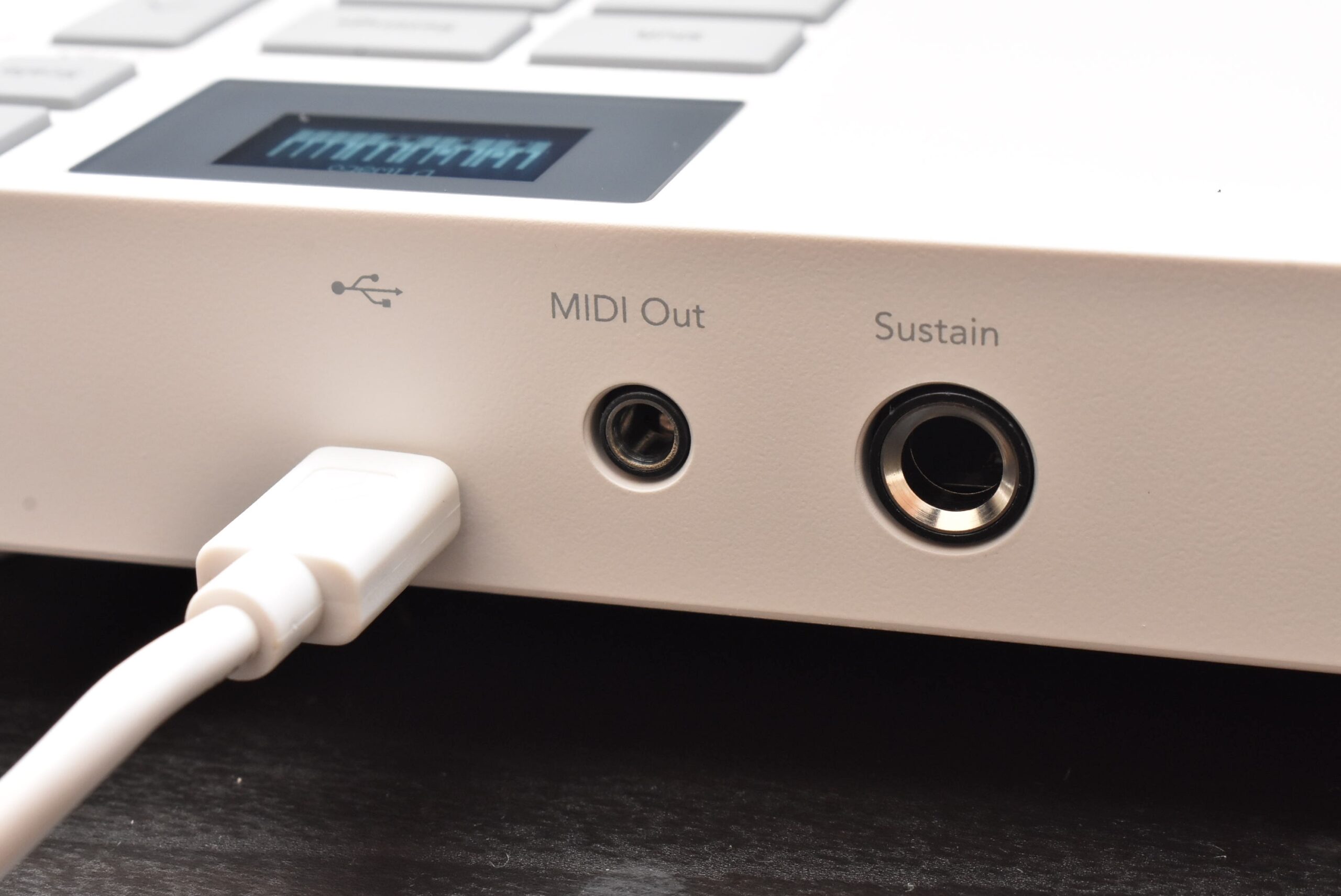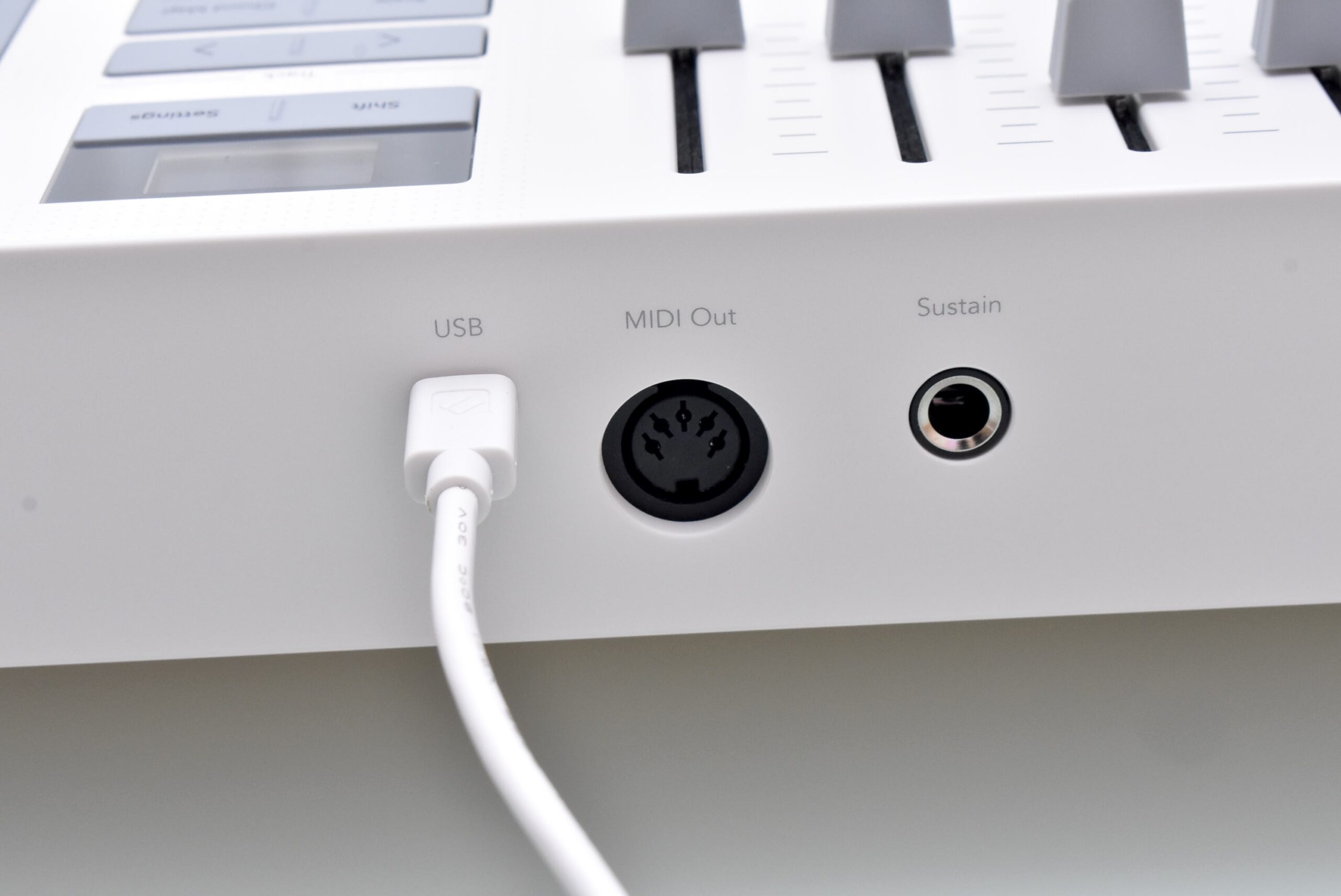 接続端子としては、PCとの接続に使うUSB-C端子に加え、Miniモデルは3.5mm、それ以外は5ピンMIDI OUT端子やサスティンペダル入力も装備しているため、外部ハードウェア音源のコントロールや本格的なピアノ演奏にも対応できる拡張性を備えています。