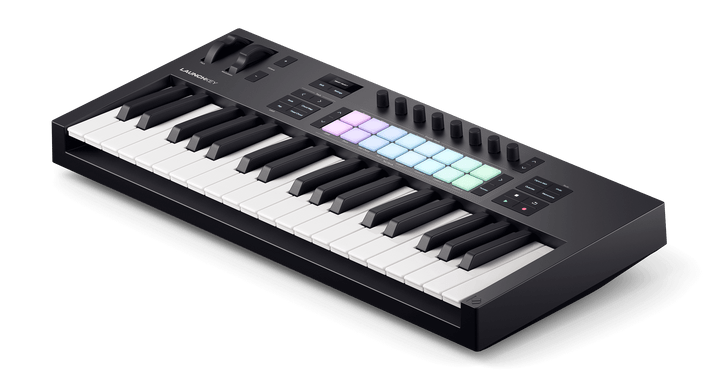 Launchkey Mini 25 MK4は、横幅32cm程度と極めてコンパクトで、バックパックにも余裕で収まるサイズ感。ビートメイキングやループのトリガー、簡単なベースラインの入力が主体であれば、このサイズでも十分に性能を発揮します。一方、Launchkey Mini 37 MK4は 鍵盤数が1オクターブ増えることで、右手でメロディを弾きながら左手で簡単なコードを押さえるといった、より本格的な作曲スケッチが可能なサイズと演奏性のバランスが取れたモデルとなっています。