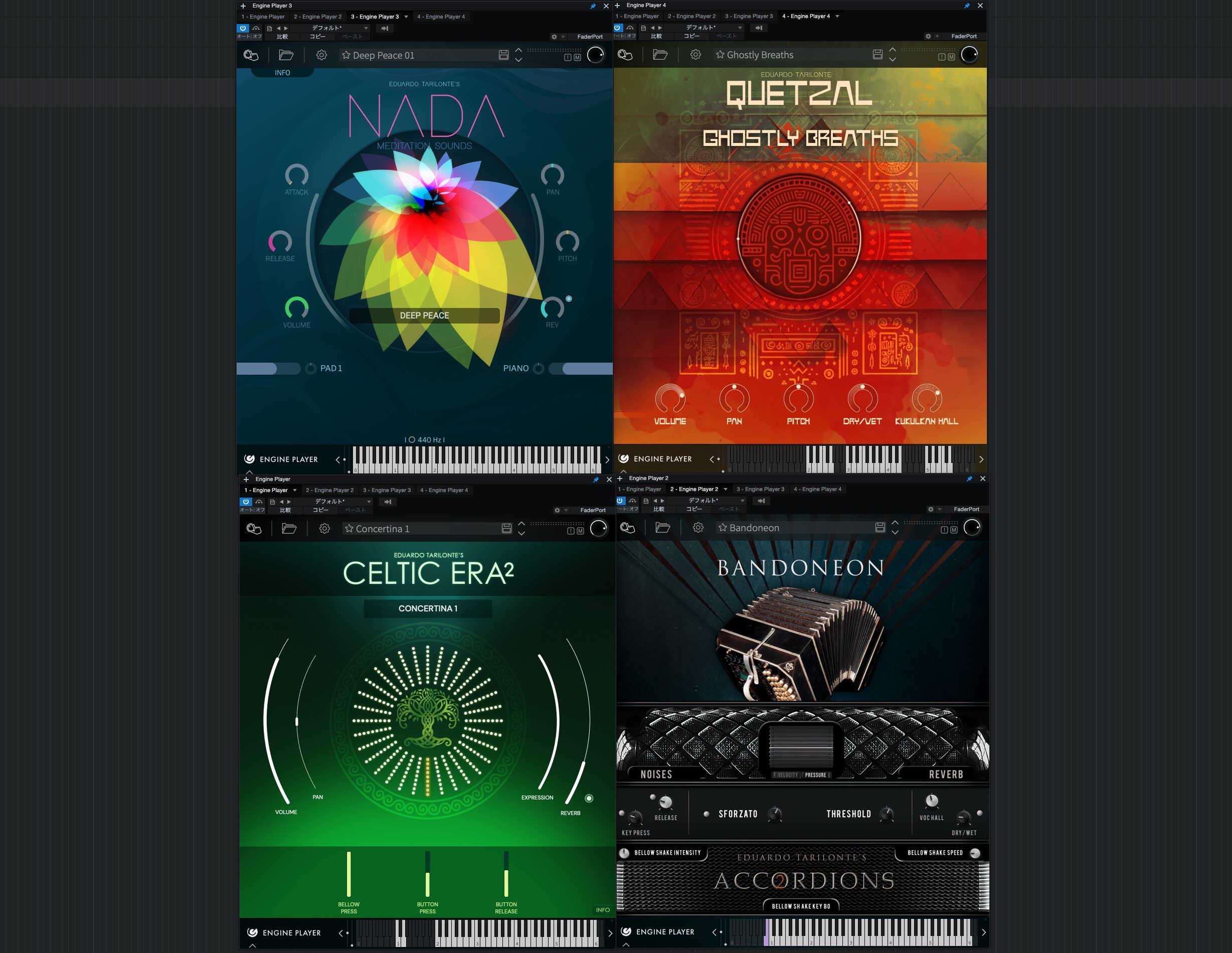 イギリスの著名な音楽雑誌「Sound on Sound」などで数々のアワードを受賞するなど、世界中のコンポーザから絶大な支持を得ているエドゥアルド・タリロンテが手掛けた音源が今回、軽量なENGINE PLAYERで使えるようになったことで、その唯一無二の世界観を、より多くのクリエイタが手軽に、そして快適な制作環境で体験できるようになったのです。