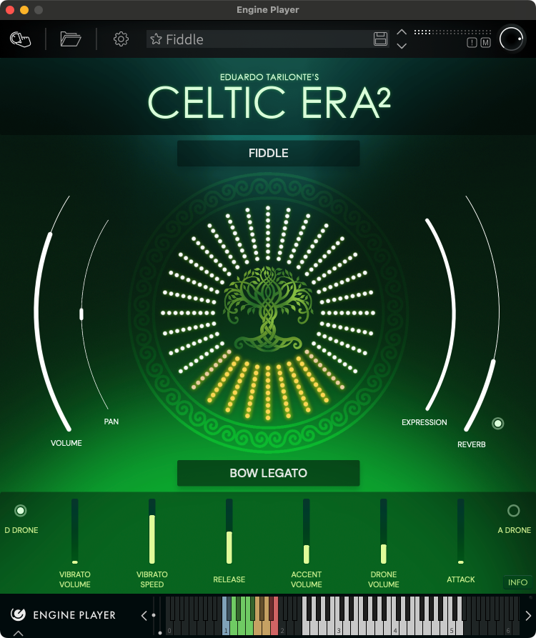 まず紹介するのは、エドゥアルド・タリロンテさんの代表作の一つであり、ケルト音楽に特化した総合音源の決定版ともいえるCeltic ERA 2。このライブラリには、フィドルやイーリアンパイプ、バウロンといったケルト音楽に不可欠な伝統楽器はもちろんのこと、青銅器時代にまで遡る古代の角笛CarnyxやDordまで、合計36種類もの膨大な楽器が収録されています。そのサウンドは非常にクオリティが高く、楽曲に加えるだけで、ケルト音楽特有の壮大で、どこか物悲しい雰囲気を作り出すことができます。