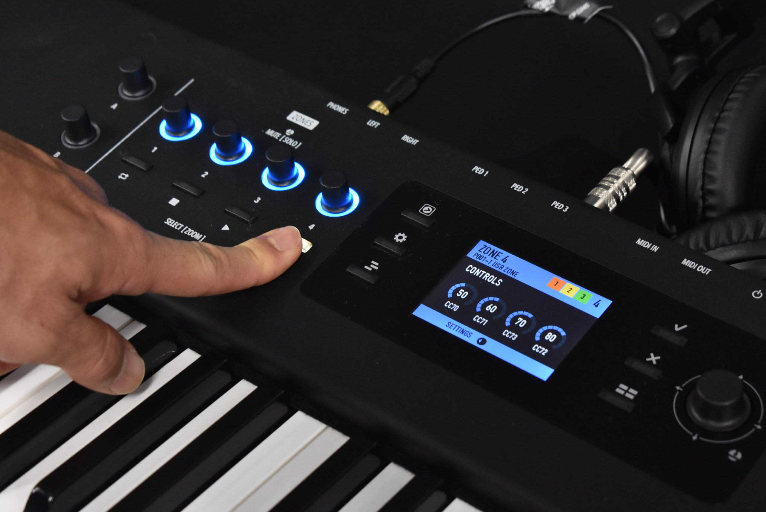 ユーザインタフェースはNuma X Pianoとほぼ共通で、本体中央には高解像度のTFTカラーディスプレイが配置され、その両脇にあるエンコーダやボタンによって、直感的な操作が可能となっています。Numa X Pianoでは内蔵音源のパラメータを詳細にエディットするために使われていたこのインタフェースが、SL MK2では外部のソフトウェア音源やDAWのコントロールのために解放されています。4つのゾーン設定やエフェクトのルーティングなど、複雑になりがちな設定も視覚的に分かりやすく、ストレスなく行うことができますよ。