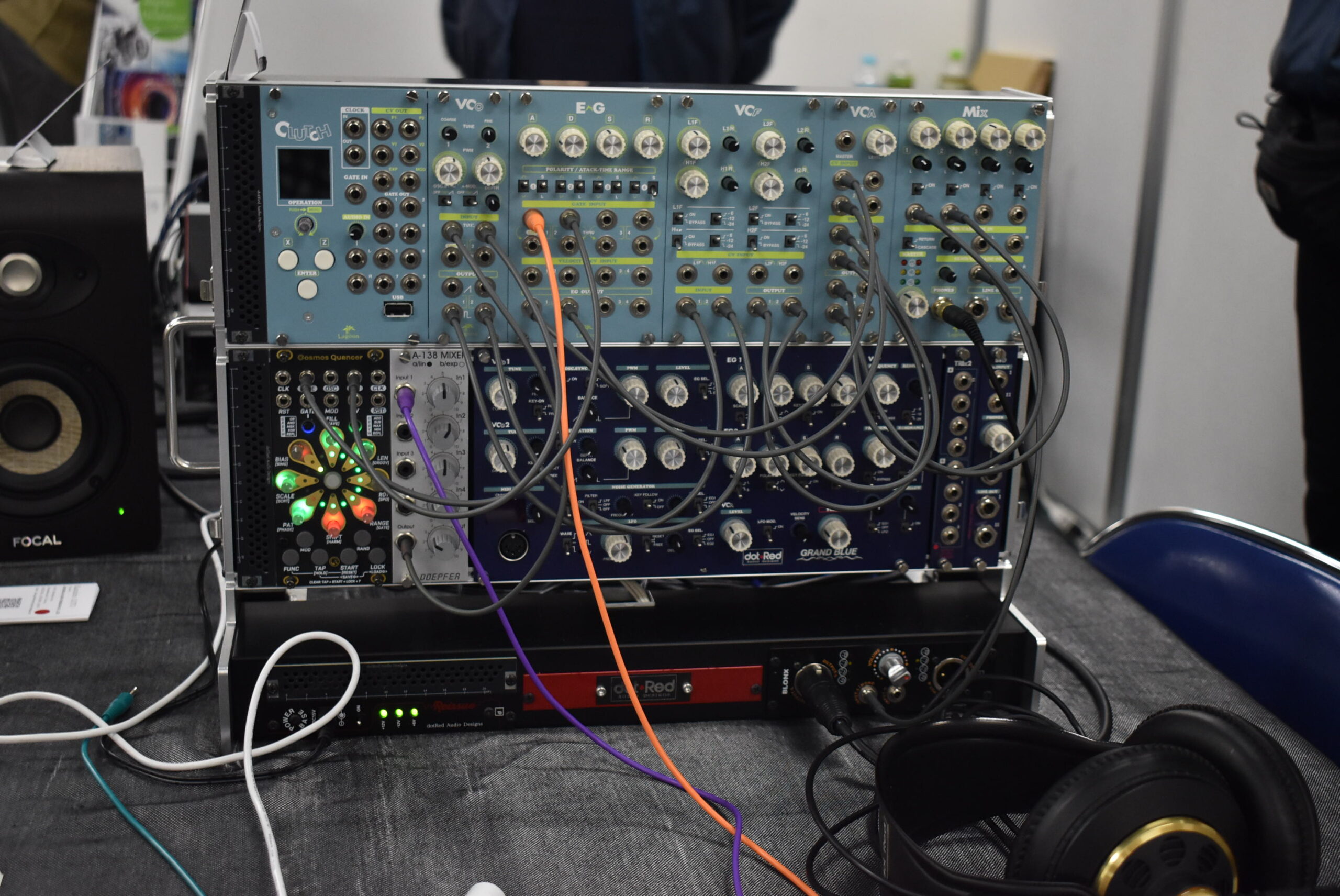 10年ほど前からユーロラックのモジュラーシンセを開発してきたというDOTRED AUDIO DESIGNS。これがほぼ完成したとのことでの展示となっていました。写真上の青緑色のものがそれでMIDI-CV変換やアルペジエータ―などのユーリティであるCLUTCH、それにVCO、EG、VCF、VCA、MIXという構成でセットで20万円程度になるとのこと。現在最終調整をしており、年明けごろには発売する見込み、とのことでした。