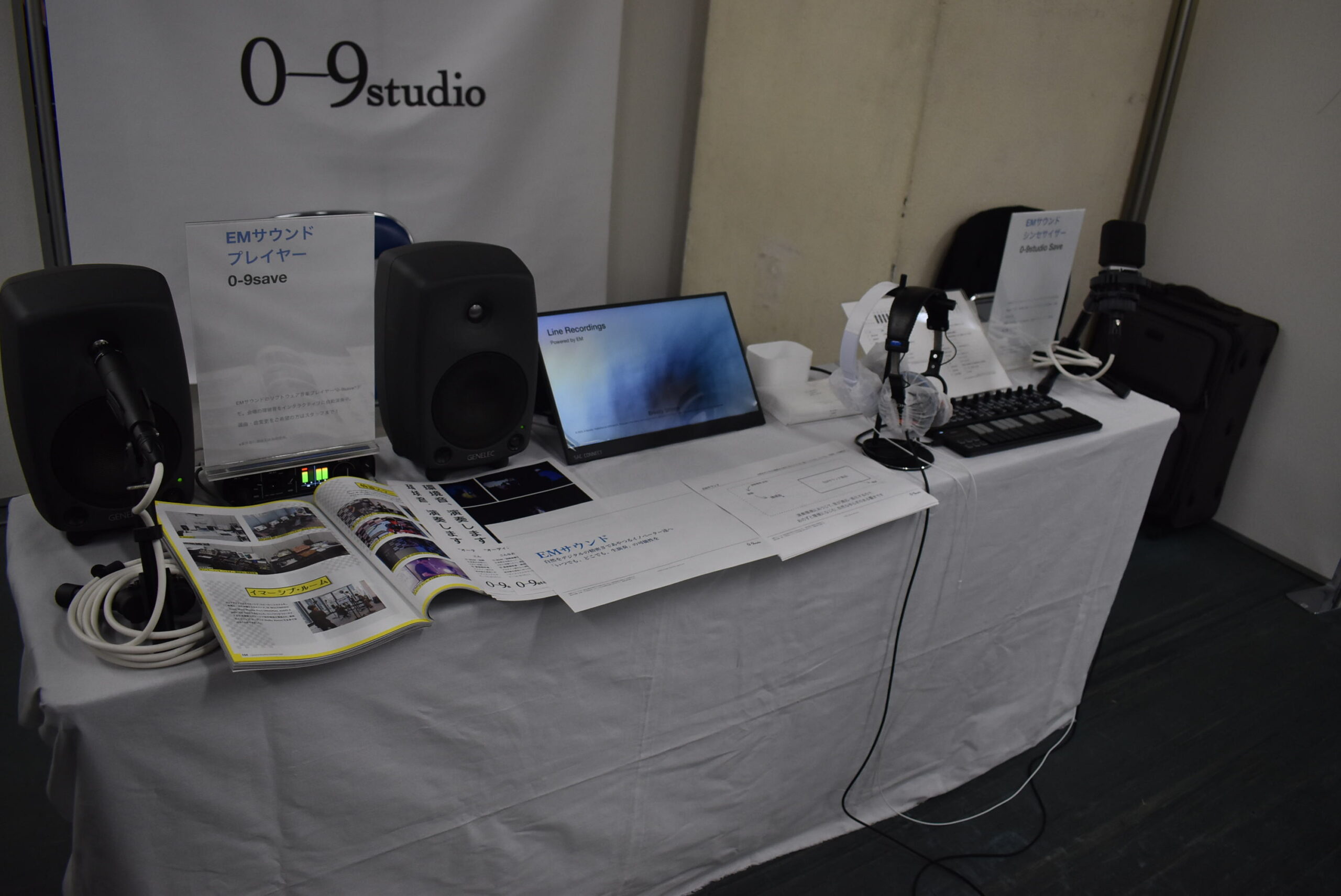 ほかにはない唯一無二のサウンドを奏でたい、という要望に対しての解として0-9studioが提供するのがEMシンセサイザー。環境音をインタラクティブに調整して奏でるというもので、10年前から開発を続け、日米で特許を取得しているとのこと。コンピュータ(Mac mini)とオーディオインターフェイス、コントローラなどで構成され、セッティングしたMac miniをレンタルする形での提供となっているそうです。