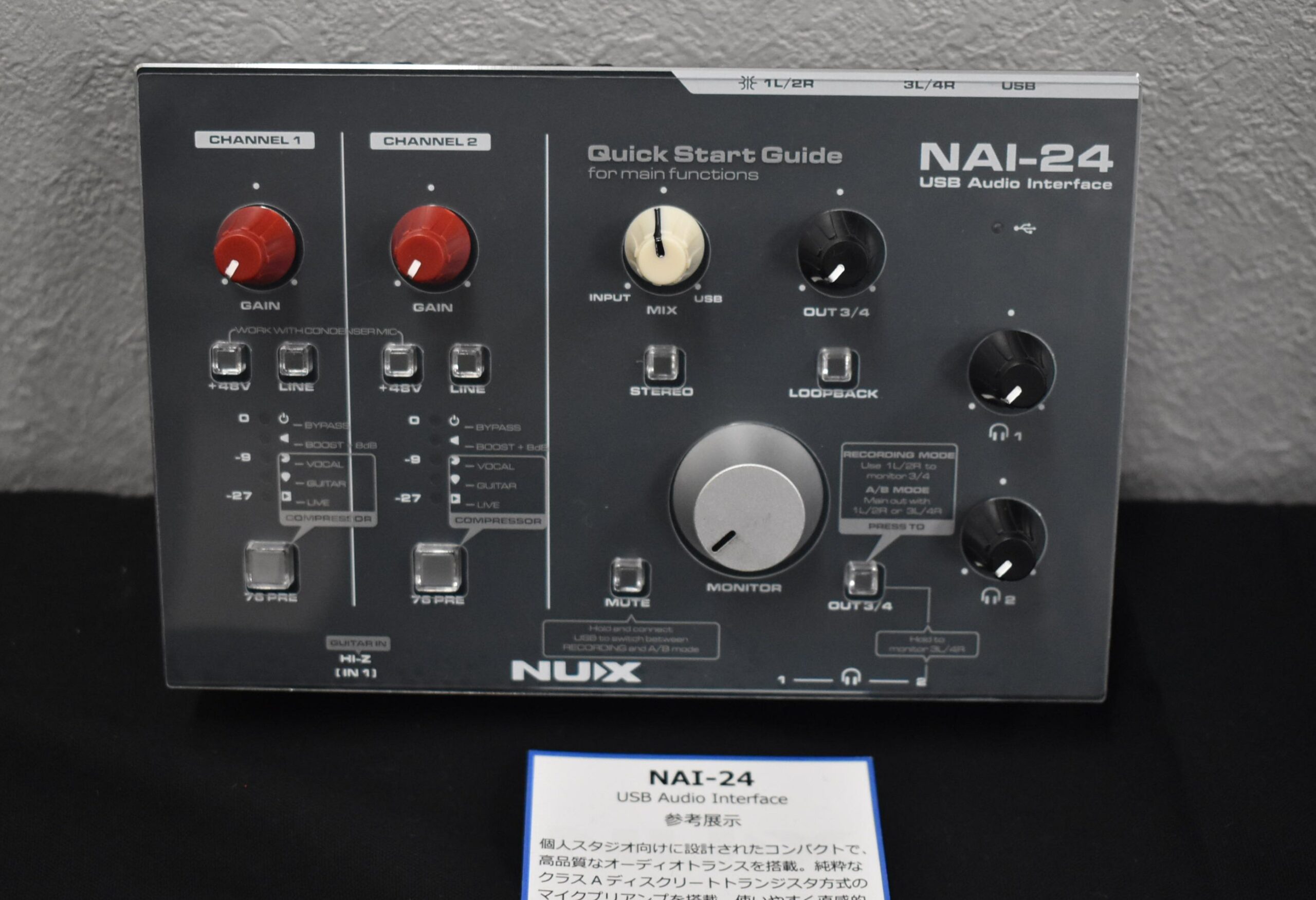 中国の大手メーカーであるNUXでは電子ピアノやMIDIキーボードとともに、NAI-24という2in/4outのUSBオーディオインターフェイスを参考出品していました。これはD/AおよびA/DにAKMのチップを使った高品位なものでありつつ、アナログのコンプレッサを搭載したことで、自動で入力音をいい感じに調整してくれるというもの。特に配信者やポッドキャスター向けに開発されたものとのこと。発売時期、価格などは未定ですが、今後の展開が気になる製品です。