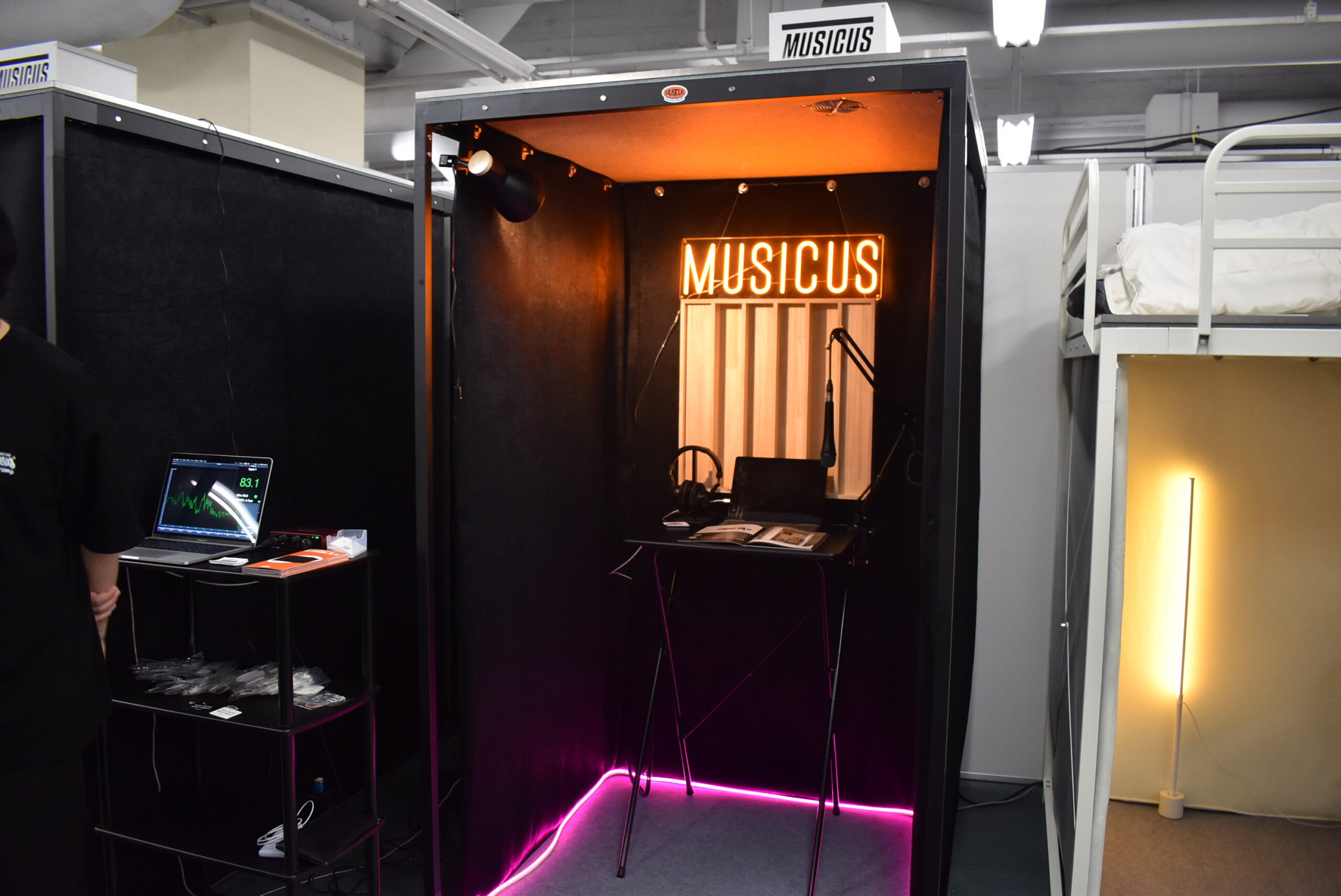 韓国メーカーのMUSICUSが展示していたのは、さまざまな防音ブース。その中のメイン製品であるB-free 2.0は92cm²~204cm²というサイズで-26dBを実現するというもの。サイズにもよりますが、基本的には1人で組み立てることが可能となっています。ファブリック素材を重ねた4重防音&吸音構造となっているため、自宅に簡単に防音のスタジオが構築できるのが特徴となっています。