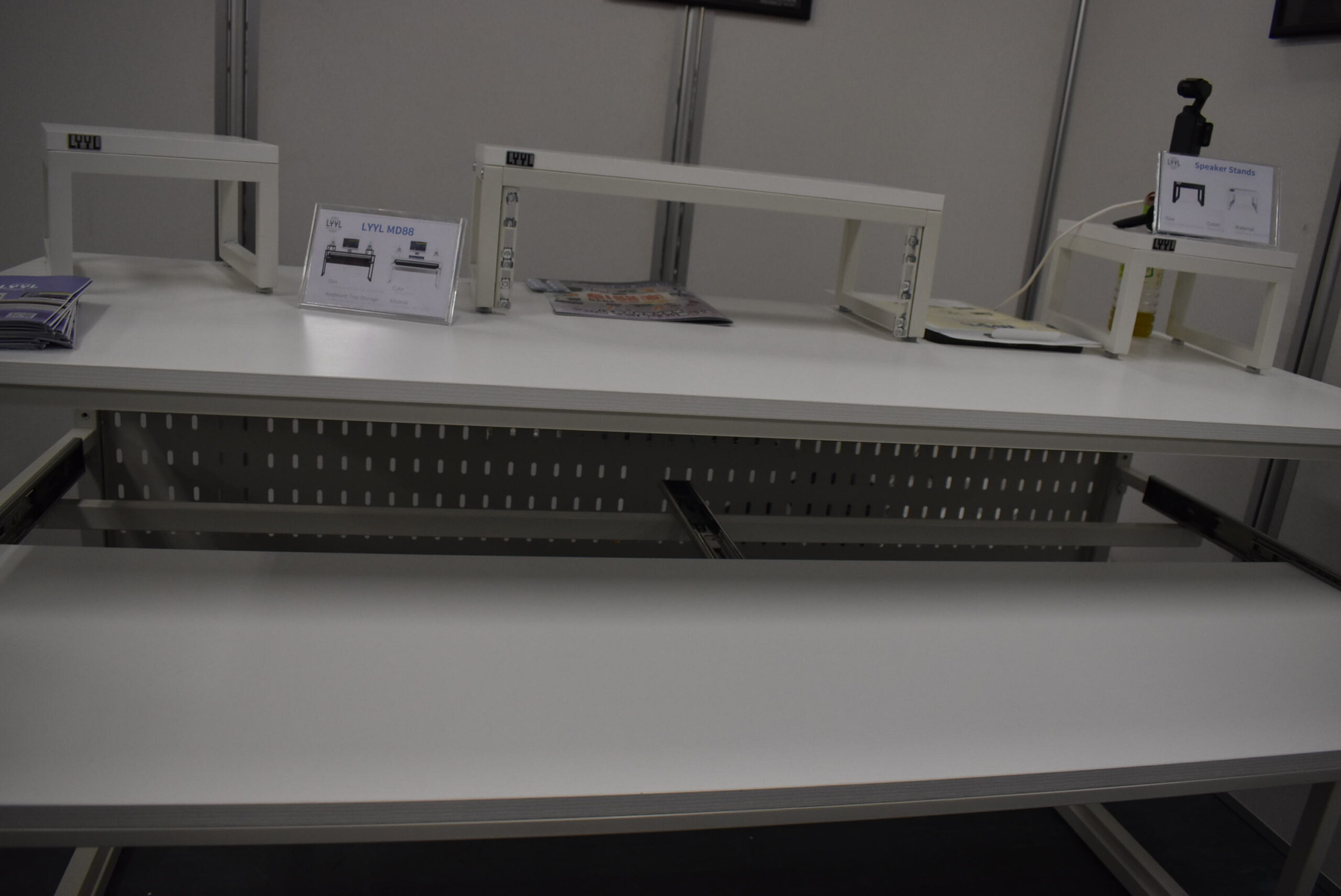 こちらも韓国のDTM用デスクメーカーです。88鍵キーボードがしっかり収まるWorkstation 88と61鍵キーボード用のWorkstation 61をそれぞれ黒と白で出しており、価格的には70,000円と68,000円。鍵盤を置く部分は前後にスライド可能で、左右だけでなく中央でも支えていることで非常に安定した構造になっているのが特徴です。