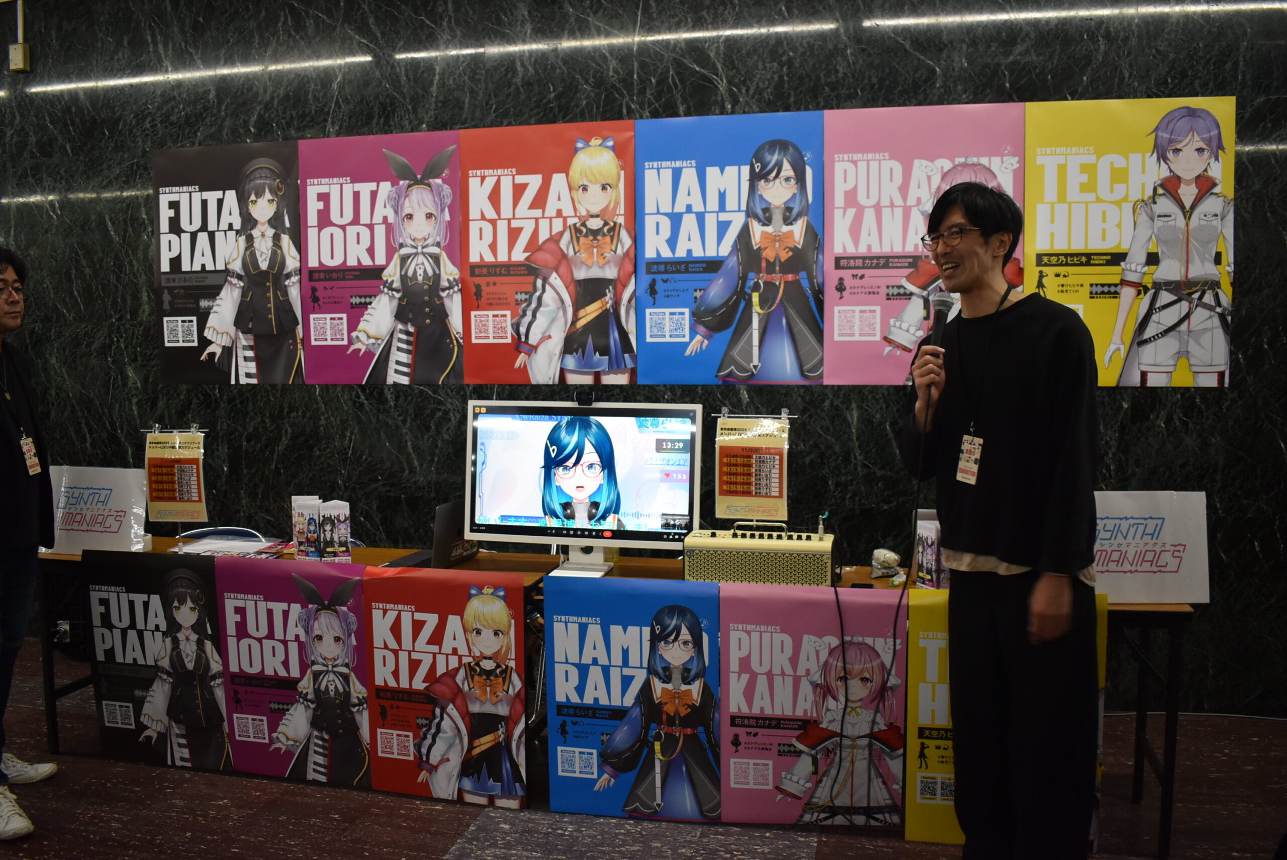 そのシンセマニアクスが楽器博会場にも降臨。ホワイエのスペースに6人のポスターが展示されるとともに、その中央に設置されたディスプレイにはタイムテーブルにしたがって、6人が順番に登場し、会場に集まった人と会話をしたり、楽器演奏などを行っていったのです。