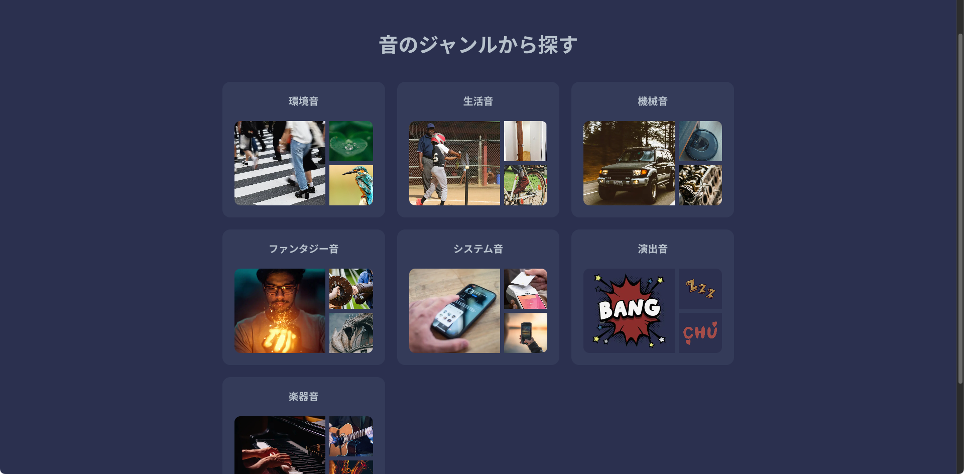 検索窓に直接ワードを入力して探したり、ジャンルを選んで、その中から探したり。ジャンルを絞った後に検索して、狙ったサウンドを探したり…など、従来のサウンドライブラリからサウンドを探すのと同様な使い方も可能。