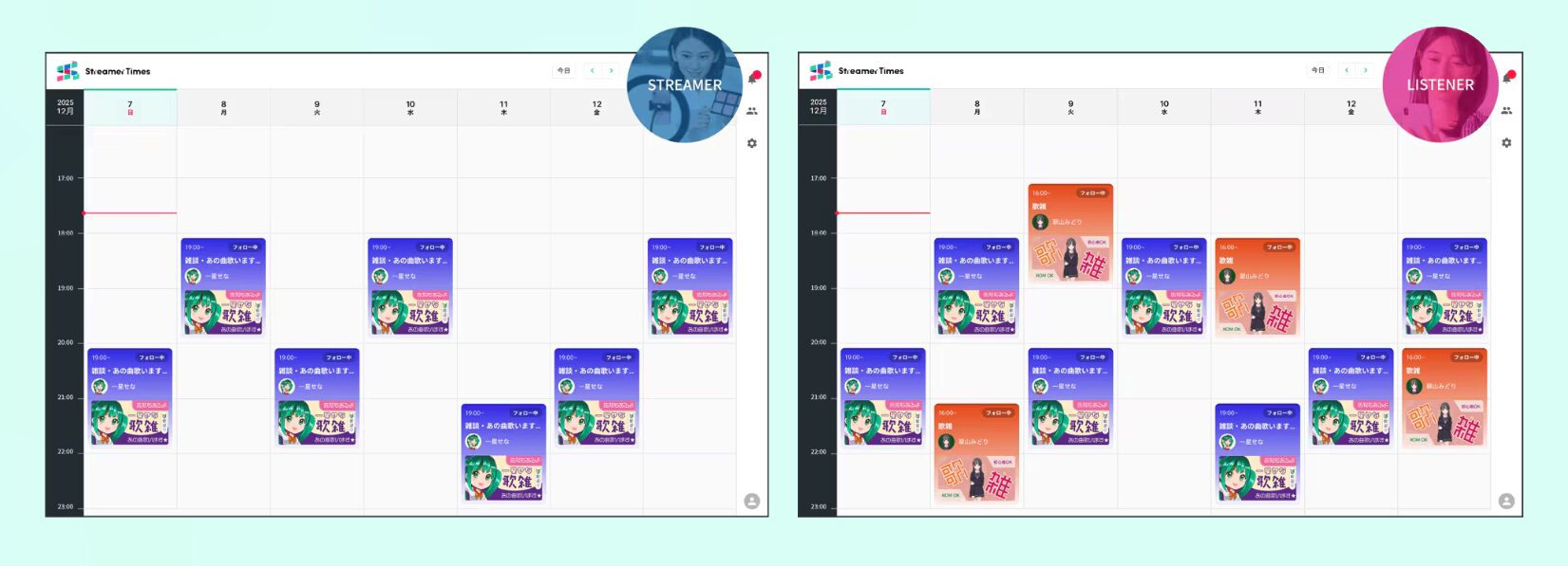 一つは、ライブ配信者、ストリーマーとリスナーをつなぐ、番組表型のスケジューラーWebサービス「Streamer Times」。これは、これまで配信スケジュールがSNSなどで個別に告知されることが多く、リスナー側が見逃しやすいという課題を解決するためのサービス。Streamer Timesでは、このスケジュール情報をプラットフォーム上で一元管理し、テレビ番組表のように見やすく提供することで、ファンによる見逃しを防ぎ、クリエイター・ファンの活動を支援する仕組みとなっています。