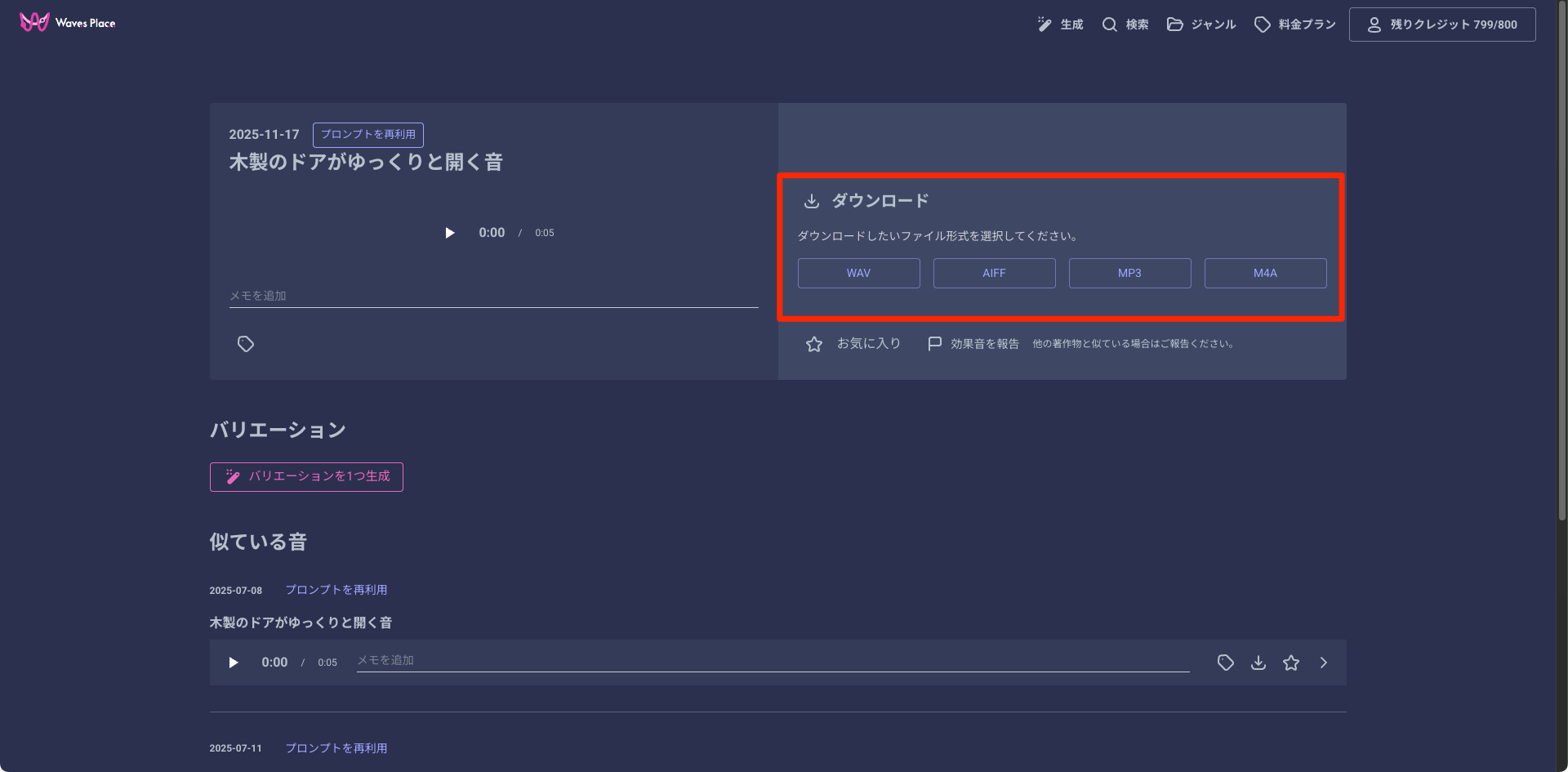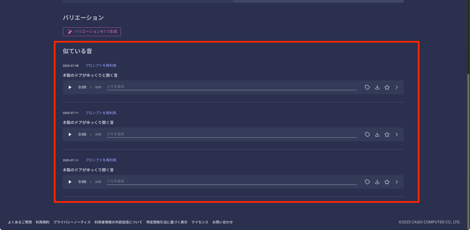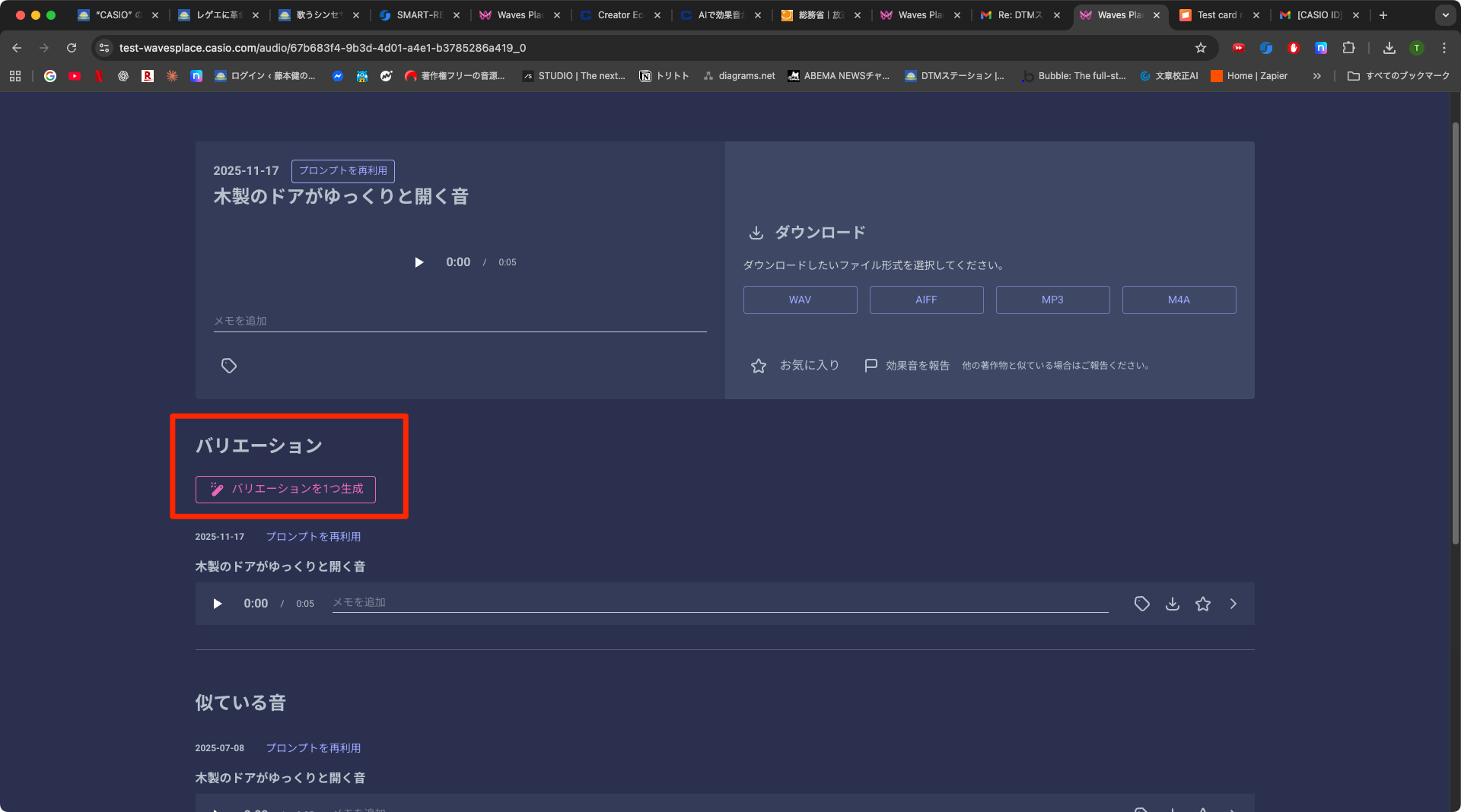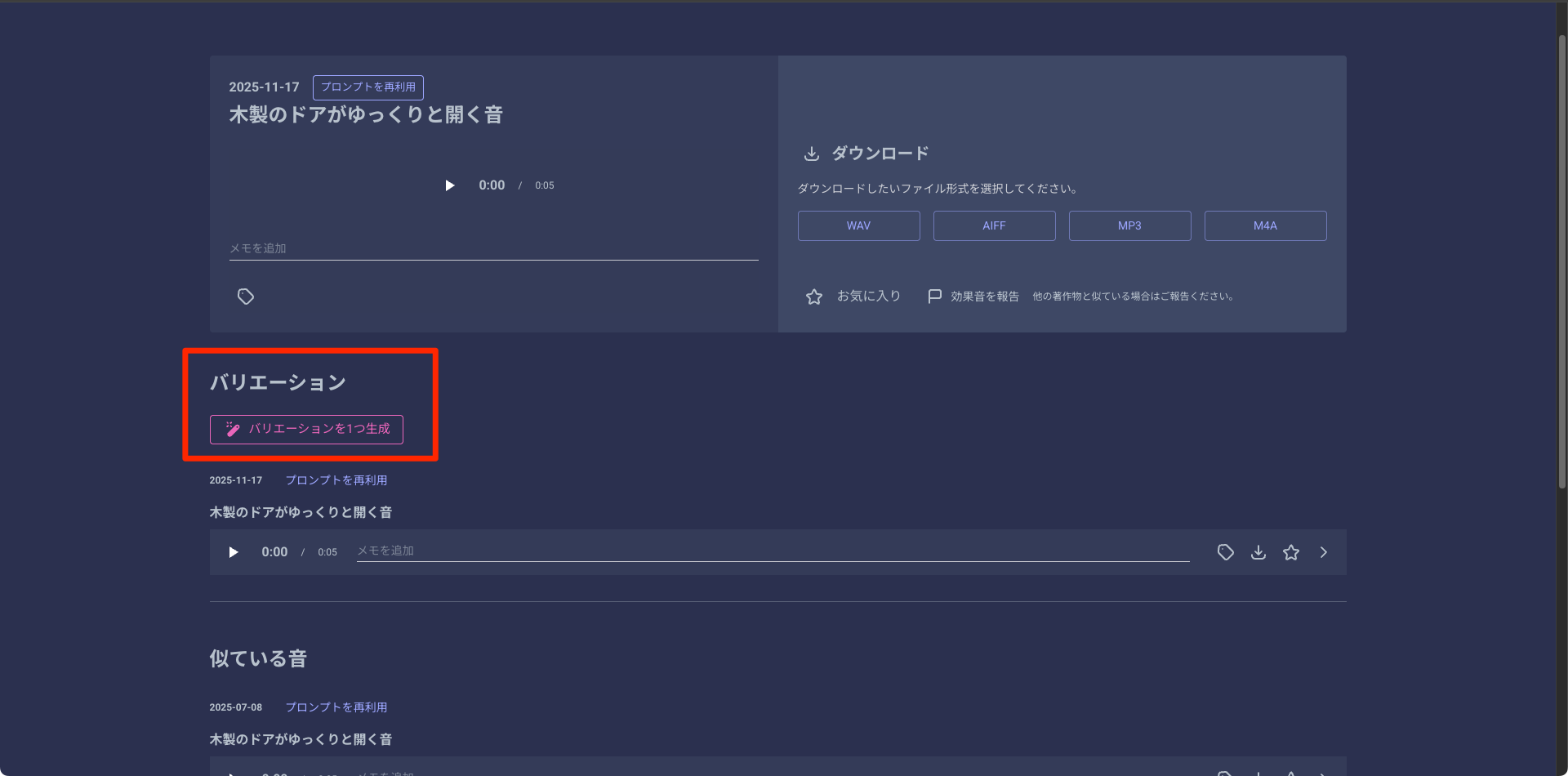 そして、「バリエーションを1つ生成」ボタンを押すと、同じプロンプトを使った別バージョンのサウンドを生成することも可能です。これにより、元の音のニュアンスや特徴を引き継ぎつつ、少し異なるパターンの音をAIに次々と提案させることができます。イメージにあと一歩届かない惜しい音を、理想の音に近づけていくことができるようになっていますよ。