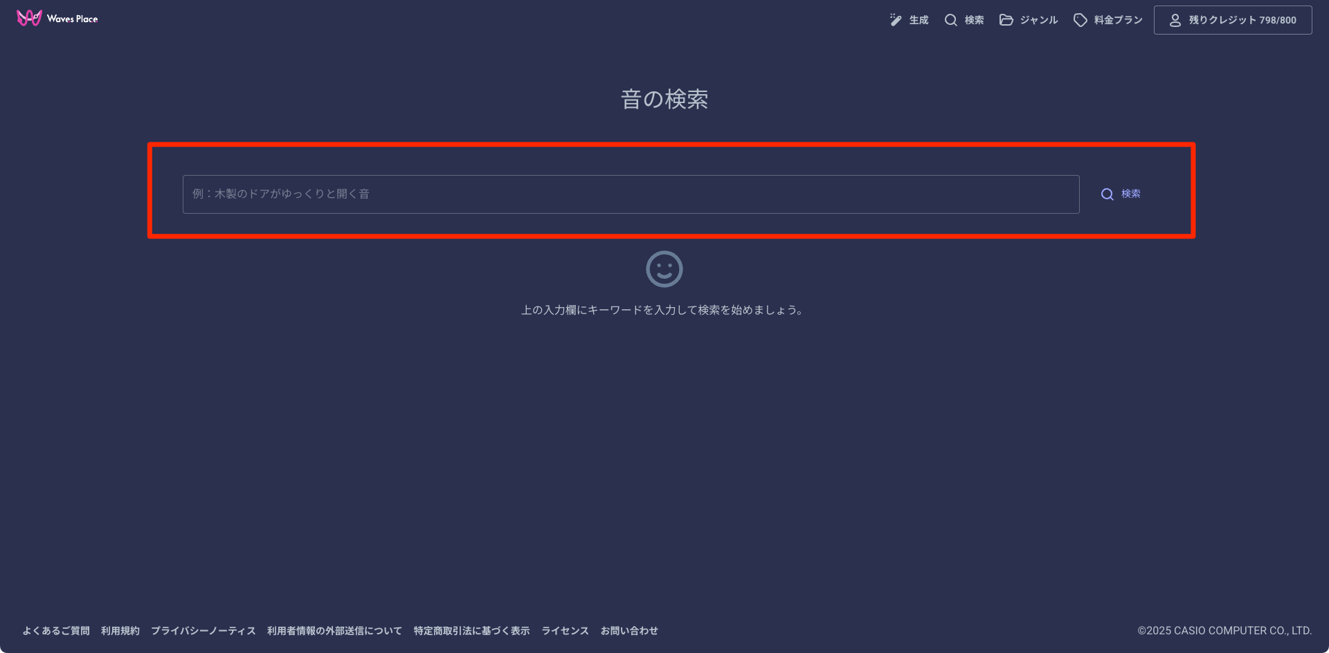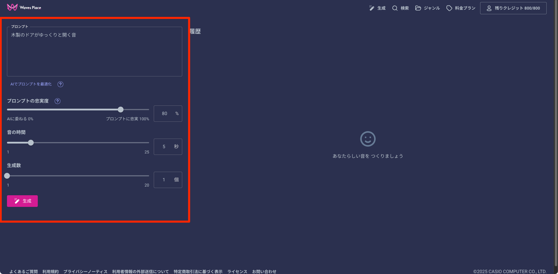 では、実際にWaves Placeを使いながら、どんなサービスとなっているのか、見ていきましょう。まずは、Waves Place(https://wavesplace.casio.com/)にアクセスしてみると、テキストを入力して、サウンドを生成できるようになっています。