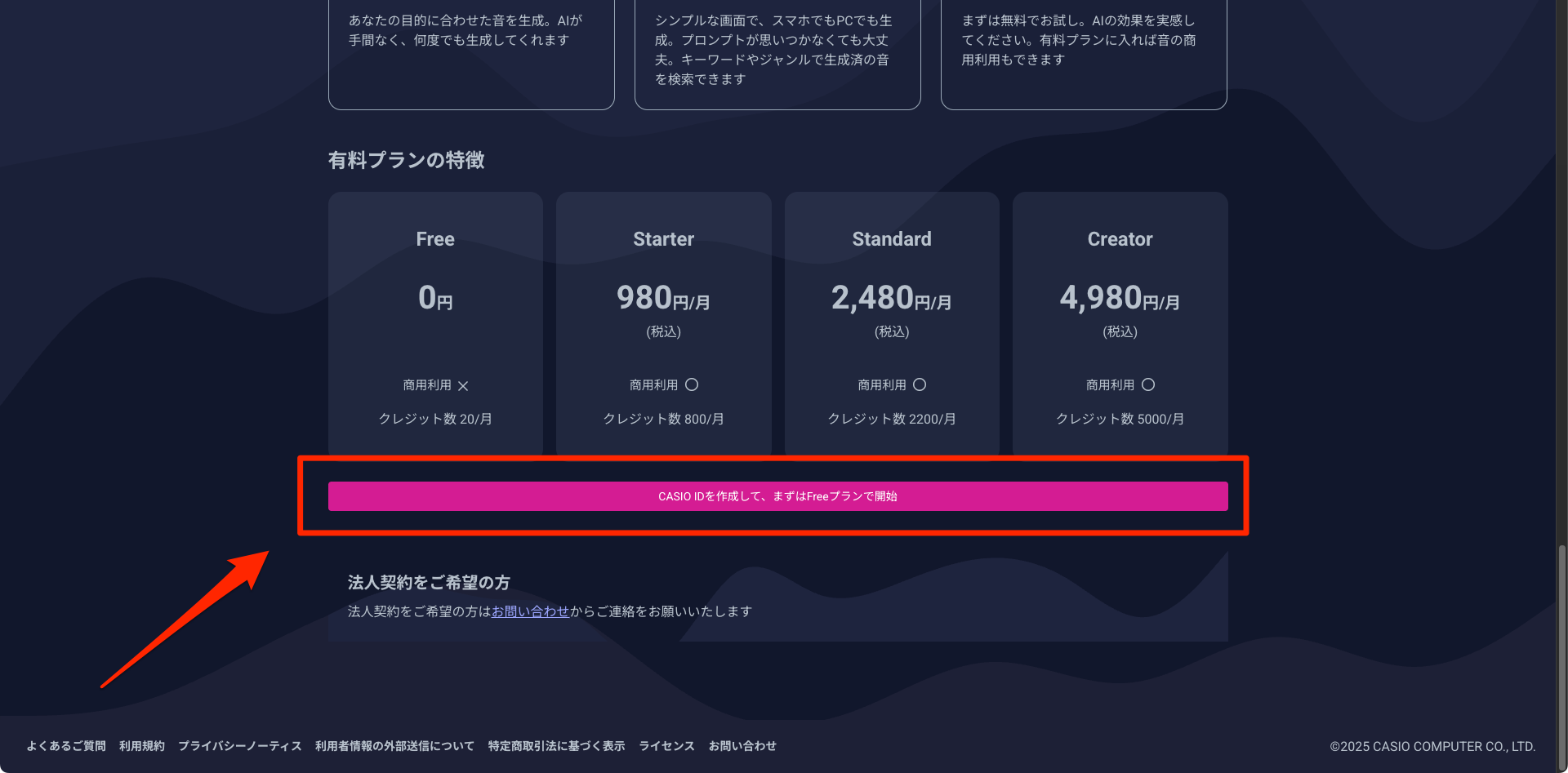 とはいえ、利用するにはまずはCASIO IDが必要なので、登録を行っていきます。最初にあった生成ボタンを押すと、自動的にスクロールダウンして、ページの下の方に行くので、そこにある「CASIO IDを作成して、まずはFreeプランで開始」ボタンをクリックします。もちろん右上にある「登録/ログイン」ボタンからアクセスしてもOKです。すると、CASIO IDを作れるページに移動するので、ほかのサービスと同様に登録を行っていきます。