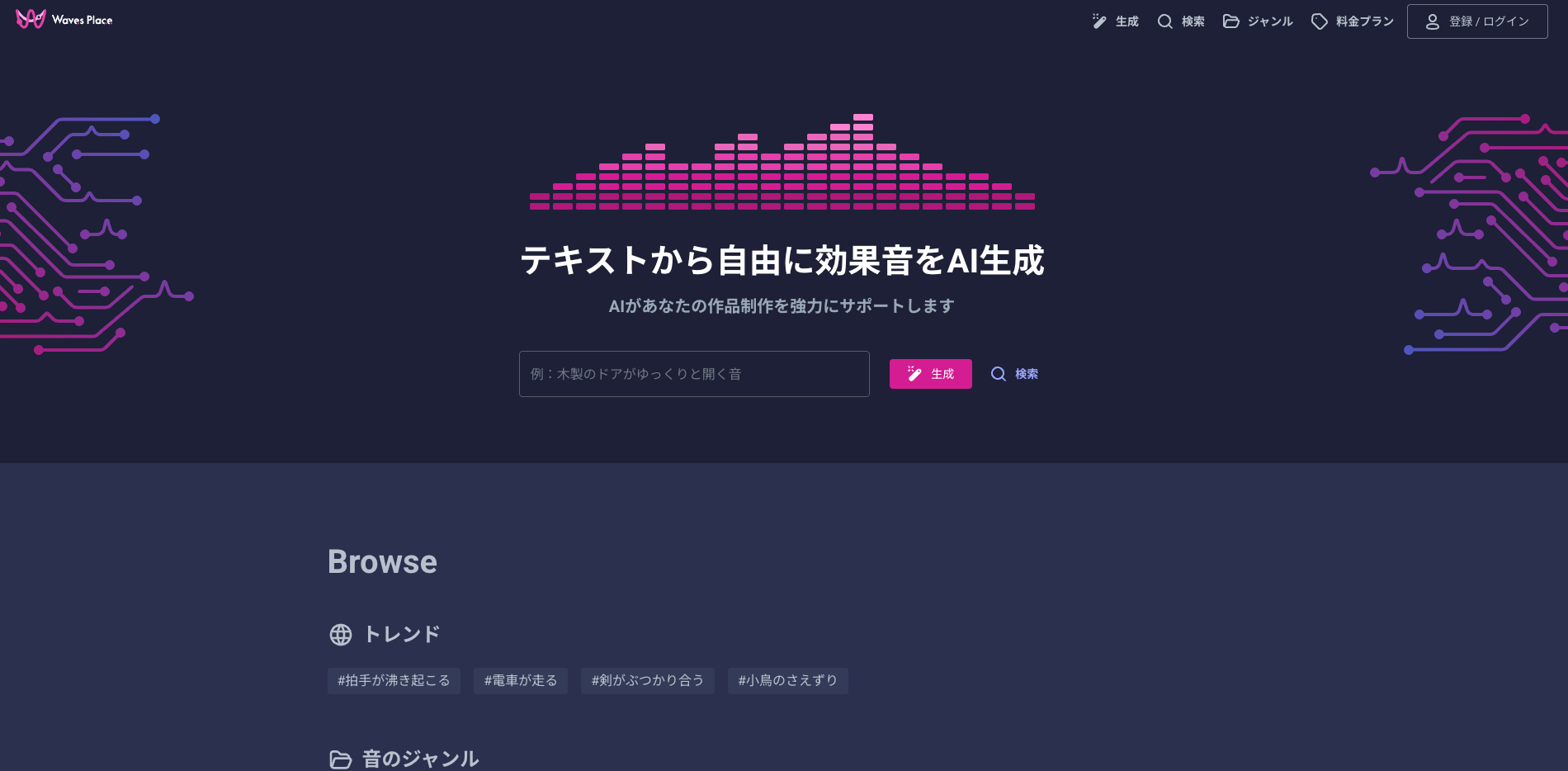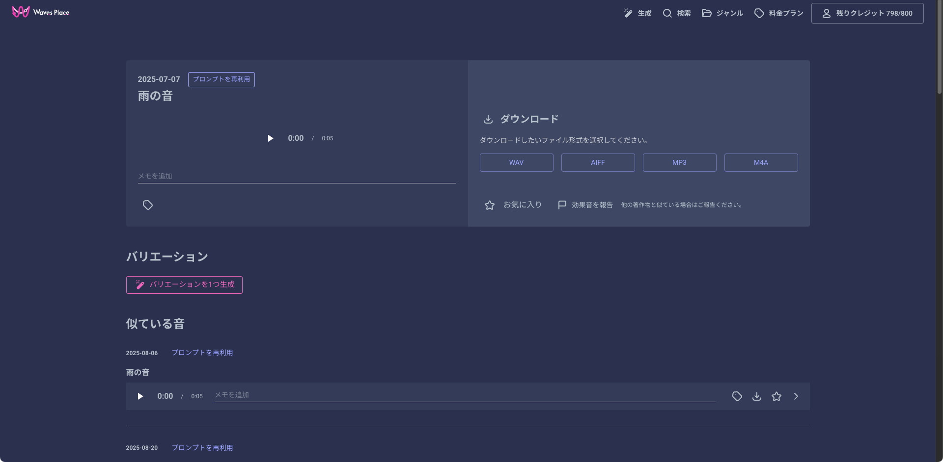 基本的な使い方は以上。誰でも使えるシンプルなサービスとなっていますね。プロンプトを入力して、少しパラメータを調整して、生成。そこから気に入るものを探していく、といった流れです。ほかにも、Waves Placeでは、データベース内に存在するほかのクリエイターが生成した音を検索することができます。