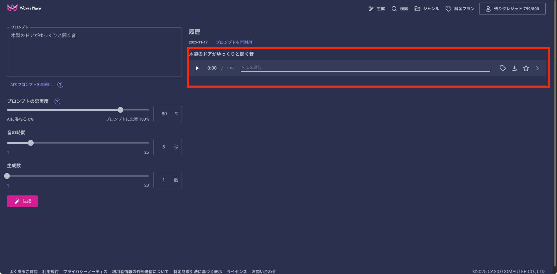 続いて、「プロンプトの忠実度」という項目で、狙い通りのサウンドを生成するか、もっとユニークで新たなアイディアを生成するか調整でき、音の時間で生成するサウンドの長さ、生成数で一度にいくつのサウンドを生成するか決めることが可能です。まずはデフォルトの設定で生成してみました。