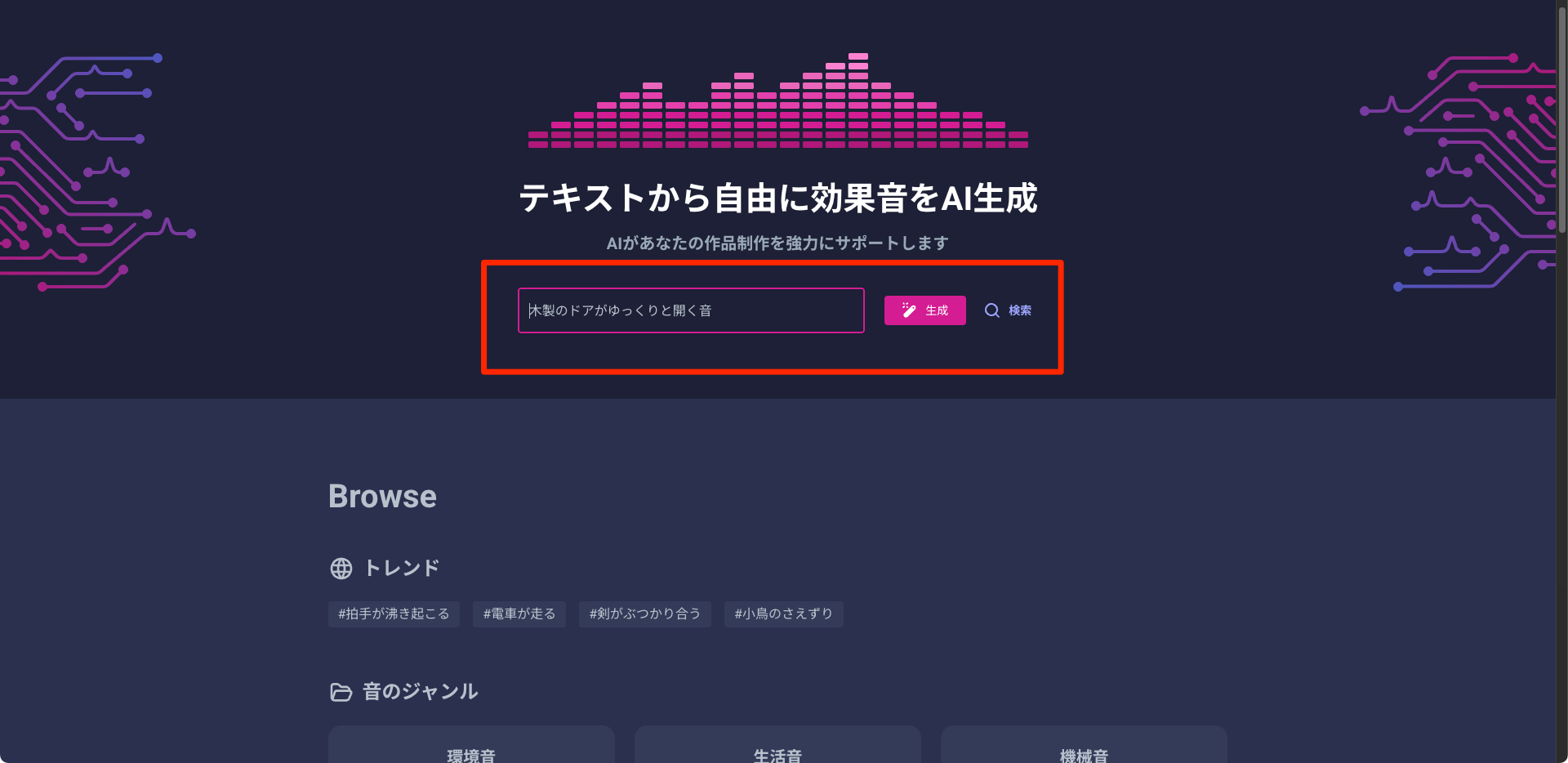 では、さっそく最初の画面で、プロンプトを入力して生成していきます。まずは、例と書いてあるように、「木製のドアがゆっくりと開く音」と入力してみました。