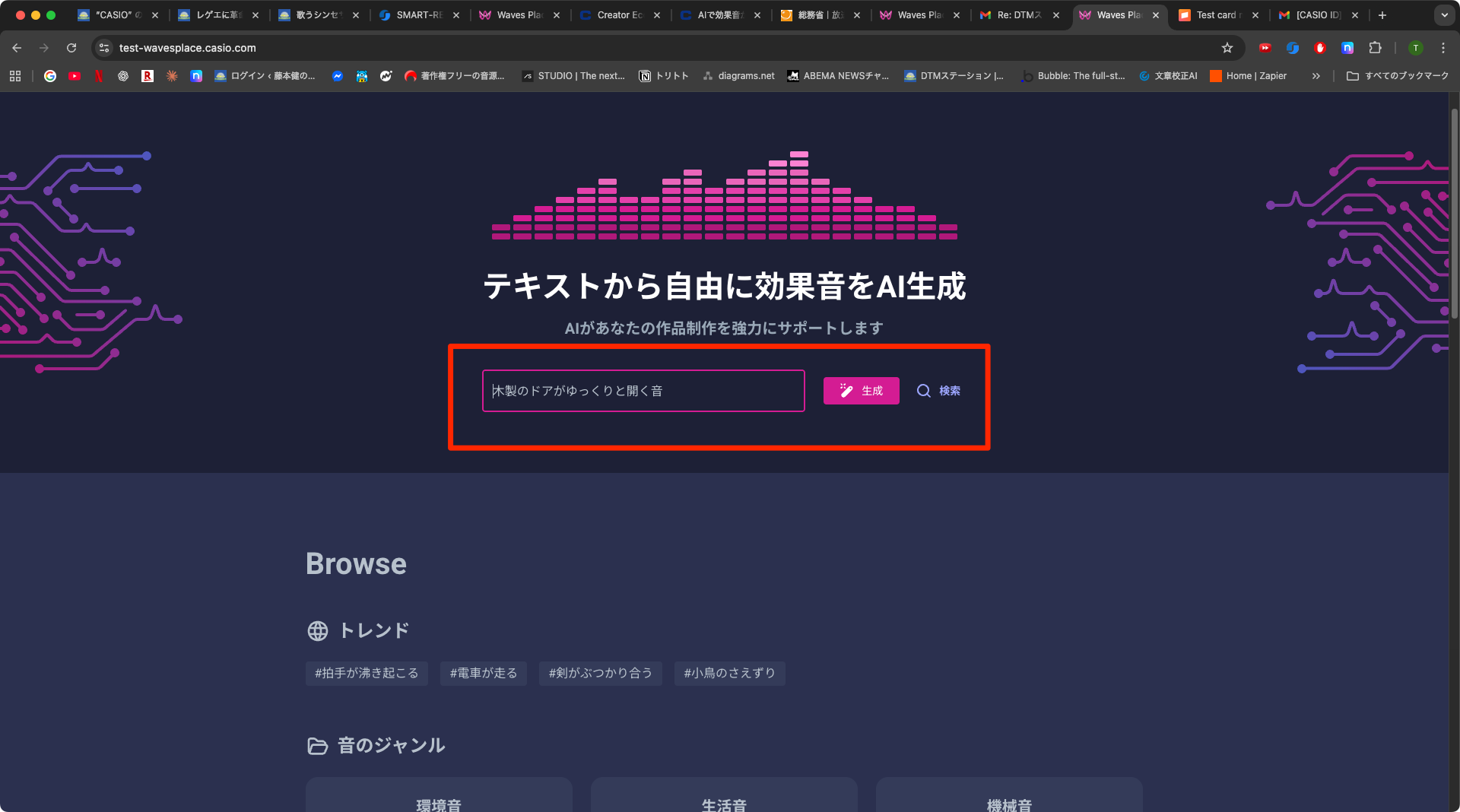 そんな悩みを、AIの力で根本から解決しようとするWebサービスが「Waves Place」というわけなのです。またCASIOの調査によれば、効果音やSEを扱う可能性のある国内のクリエイター人口は約486万人、そのうち実際に効果音を使用しているクリエイターは約329万人にも上ると推計されています。Waves Placeは、まさにこの膨大な数の人々、打ち込み系のサウンドクリエイターやバンド活動を行う音楽クリエイター、動画クリエイター、インディーゲームを含むゲームクリエイターなど、効果音を扱うすべての人をメインターゲットに据えています。