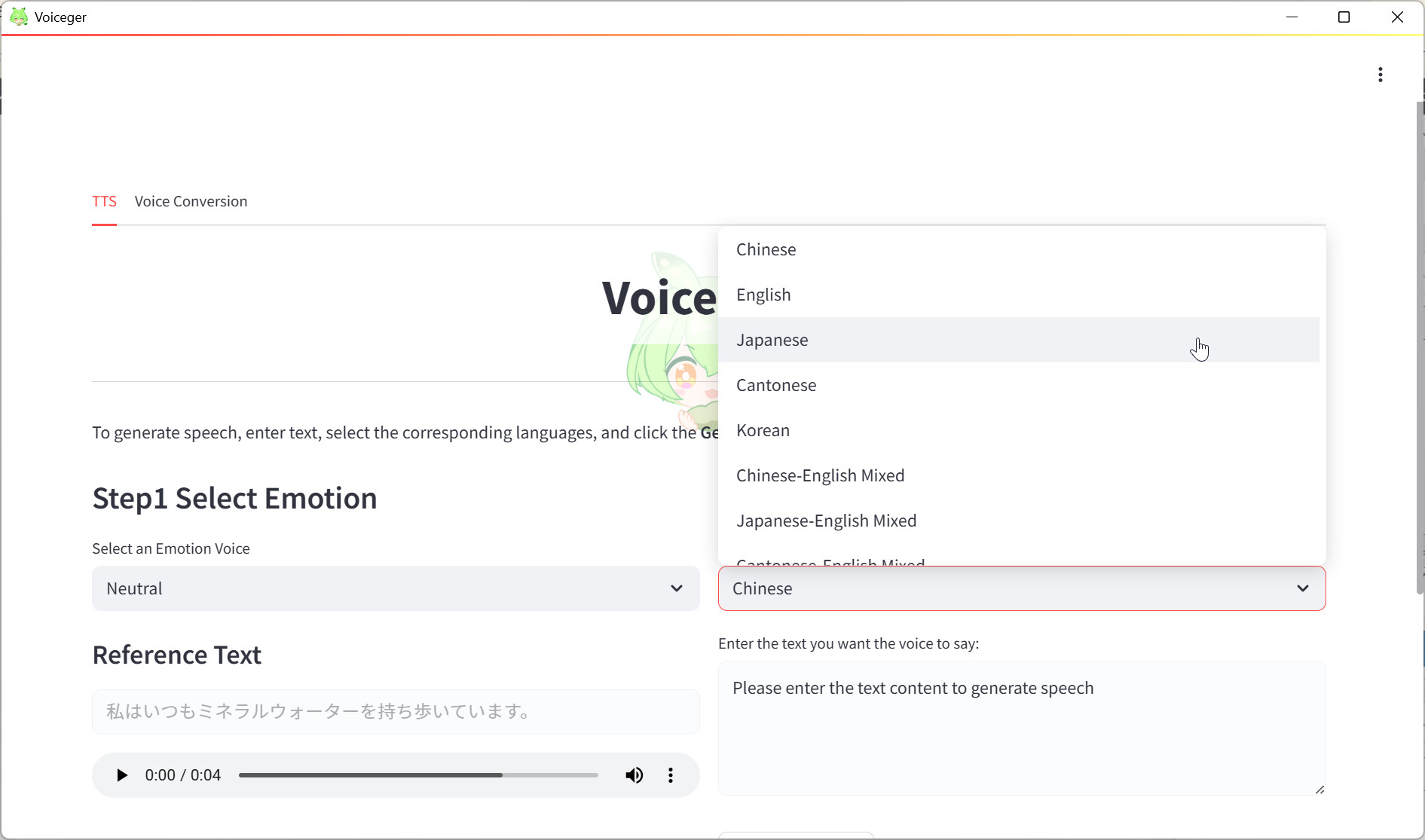 VOICEVOXはテキスト読み上げソフトとして非常に使いやすく完成度が高いツールです。VoicegerのTTS機能も同様にテキスト読み上げが可能ですが、小田さんは「VOICEVOXの方が使いやすいんで、どっちかというと多言語がなかったから多言語を補完しましょうって感じ」と説明します。つまり、VoicegerのTTSは英語、中国語、韓国語、広東語など、VOICEVOXでは対応していない言語をカバーする位置づけなのです。