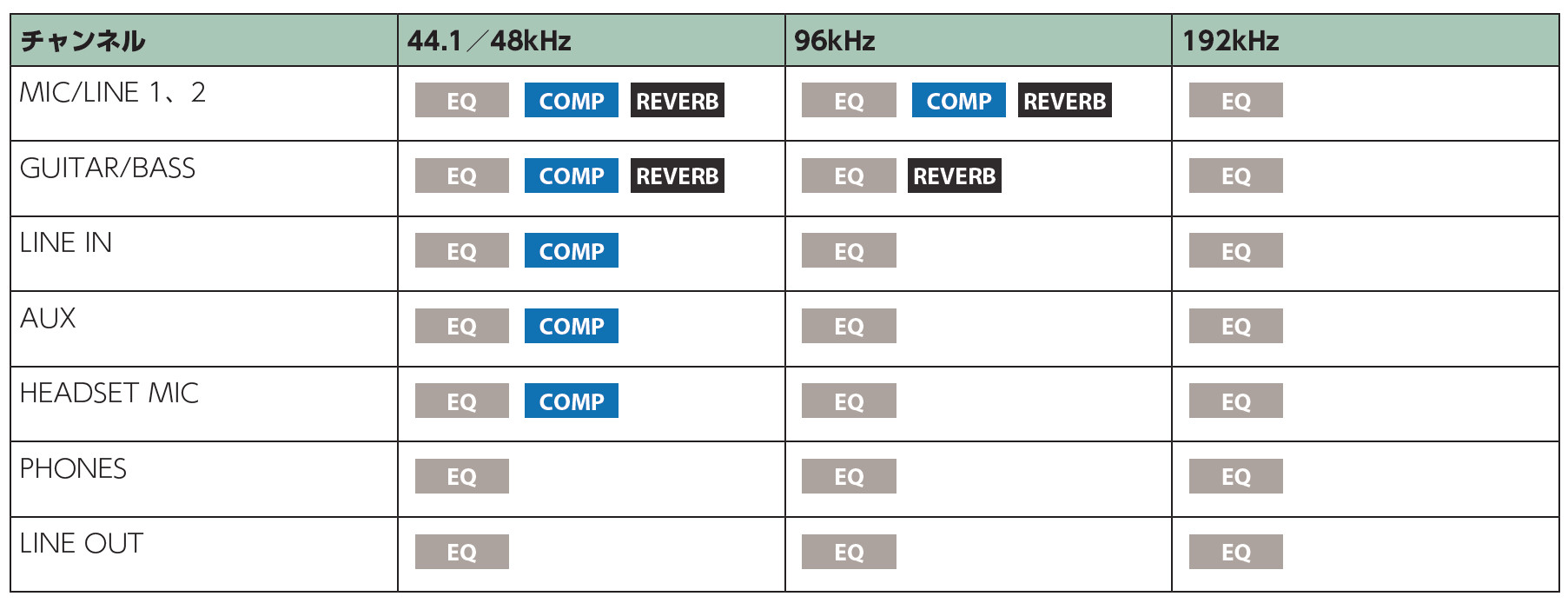 搭載されているエフェクトは、EQ、コンプレッサー、リバーブの3種類です。それぞれのエフェクトは、チャンネルごとに個別に設定でき、サンプルレートによって使用できるエフェクトが異なり、以下のような構成となっています。