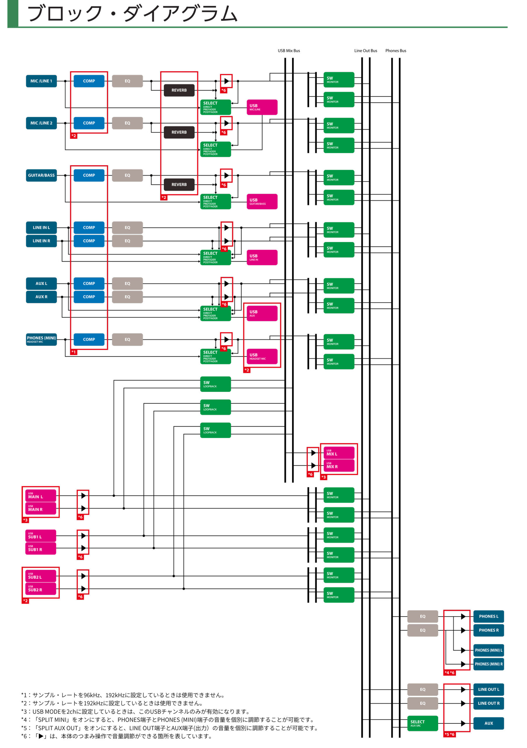 - デュアルバス搭載で、ヘッドホンとLINE OUTで異なるミックスが可能