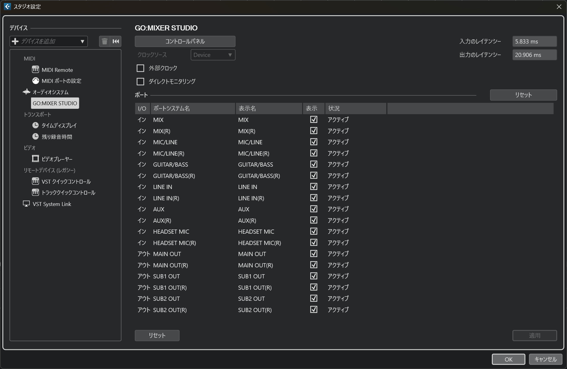 それでは、実際にWindows環境のCubaseで、GO:MIXER STUDIOがどのように認識されるか確認してみましょう。