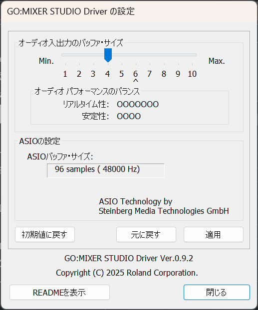 あらかじめGO:MIXER STUDIOをWindowsモードに設定しておき、Cubaseを起動し、「スタジオ」→「スタジオ設定」を開き、GO:MIXER STUDIOを選択します。ここでコントロールパネルを開くとGO:MIXER STUDIOのASIOの設定画面が登場し、バッファサイズを調整できます。